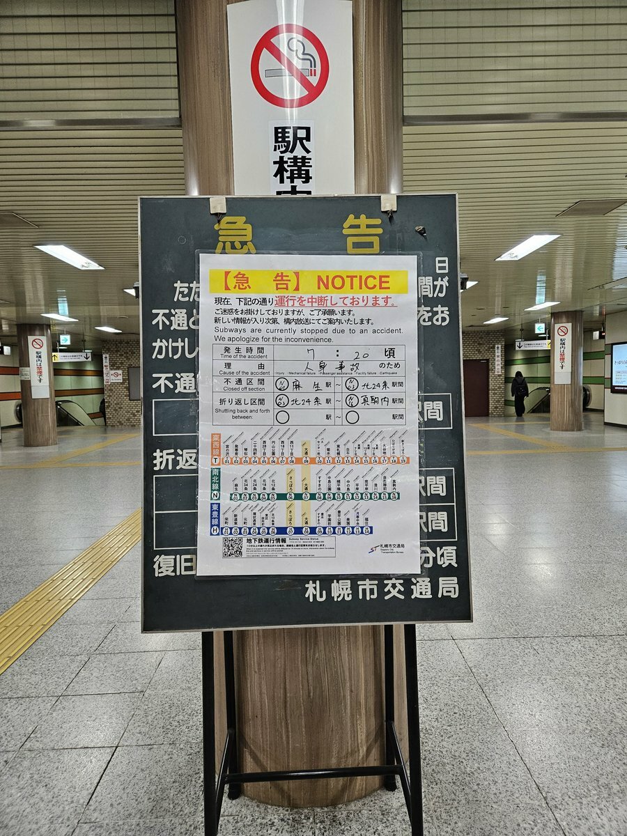 南北線、人身事故の為運転見合わせ中です#札幌#地下鉄 pic.twitter.com/fbc1UNqewb