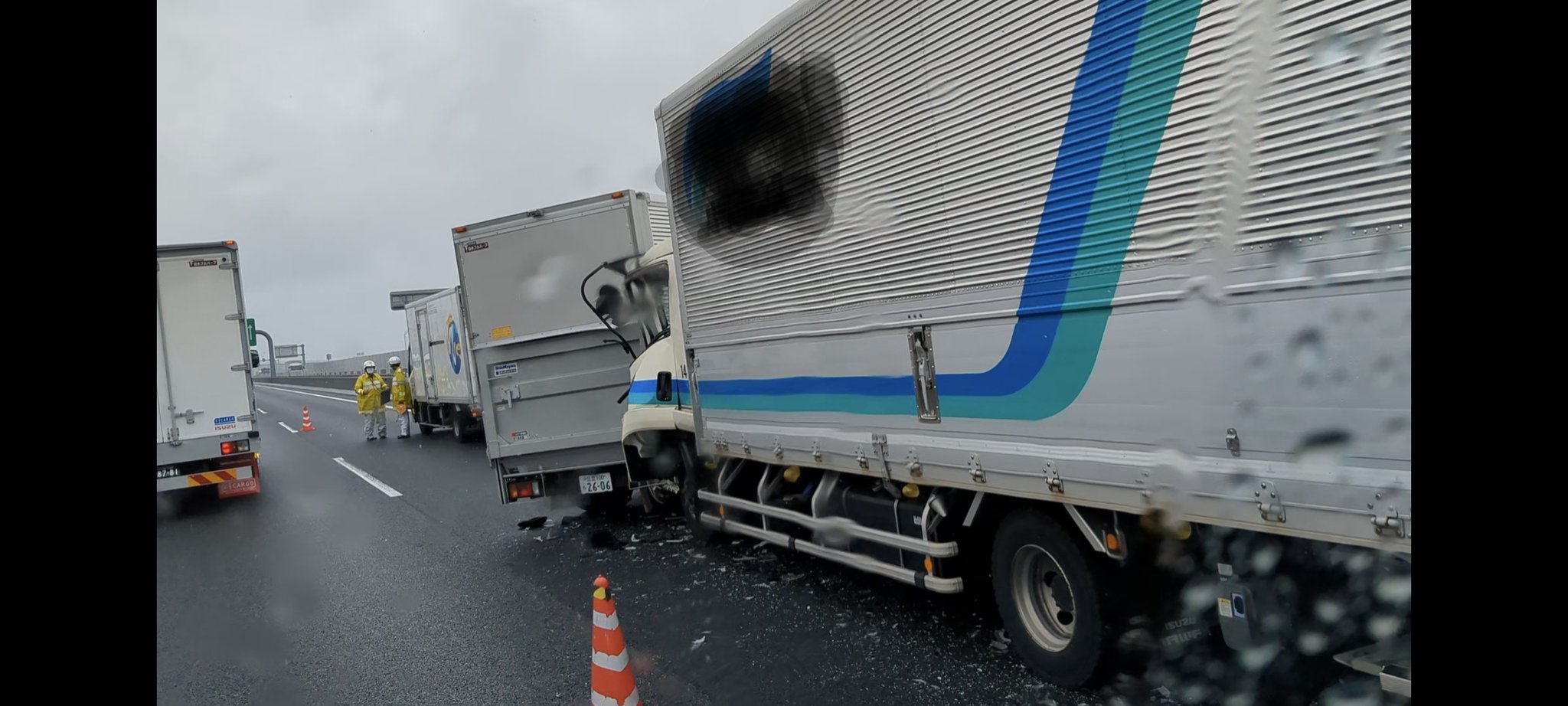 右車線2トン車2台4トン車1台の玉突き事故発生