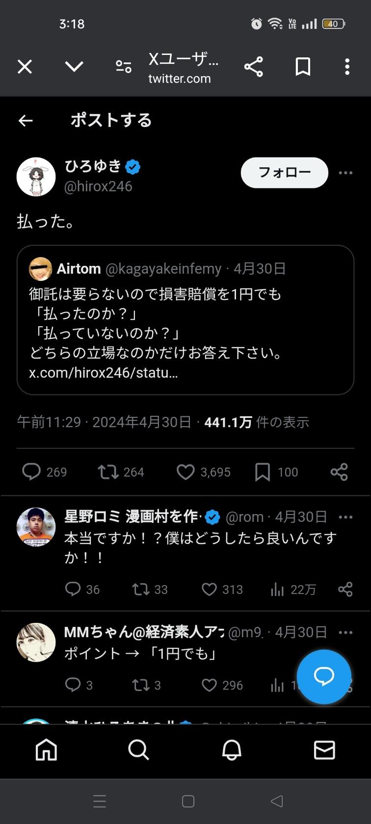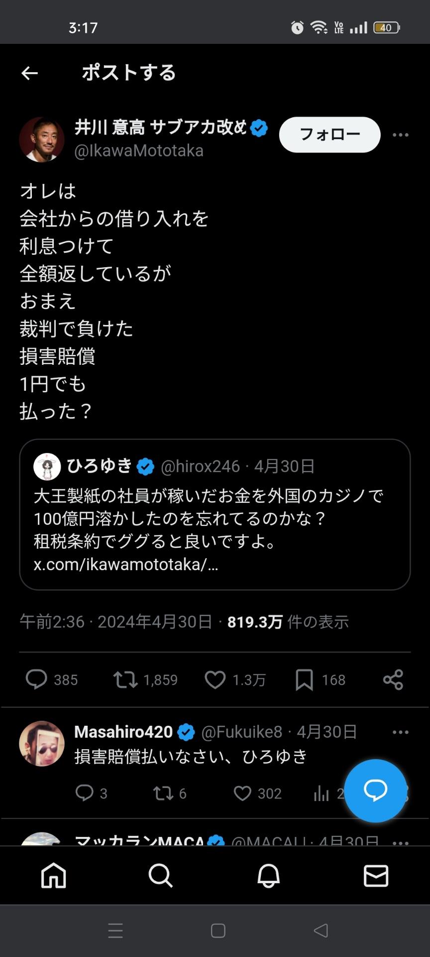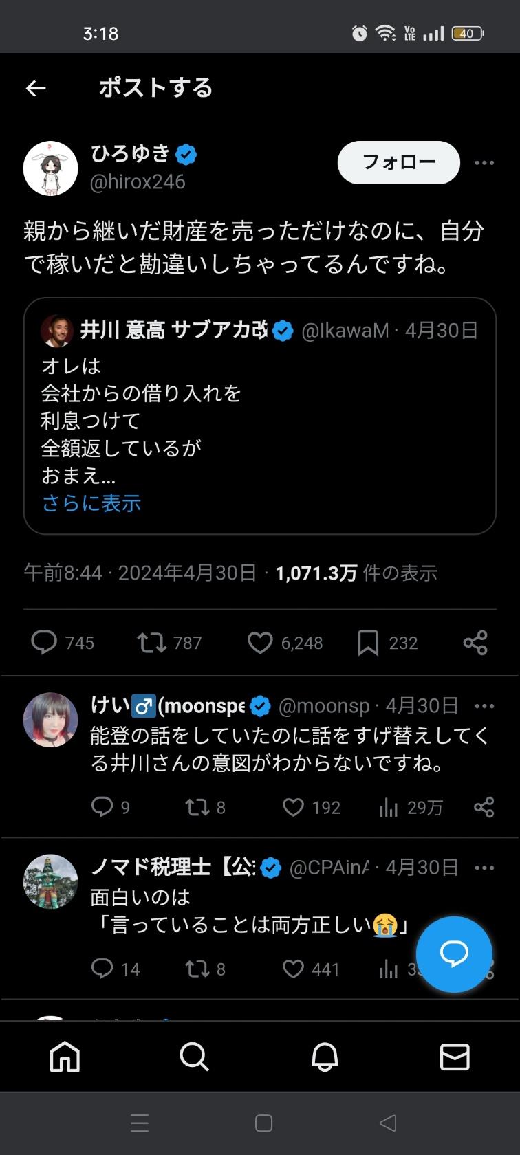 【朗報】ひろゆき、井川意高さんを完全論破「あなたカジノで100億溶かしたバカじゃんw」 2024/5/2 速報 1: ひろゆき「あなたはカジノで100億溶かしたバカじゃん」 井川「俺は会社からの借り入れを利息つけて全額返済した」 ひろゆき「親から受け継いだ財産売っただけじゃんw」 ひろゆき「オイラは自分の金で損害賠償払った」 document.write(” + ”); 関連記事 document.write(” + ”); 続きを読む ——— Source: アルファルファモザイク 【朗報】ひろゆき、井川意高さんを完全論破「あなたカジノで100億溶かしたバカじゃんw」