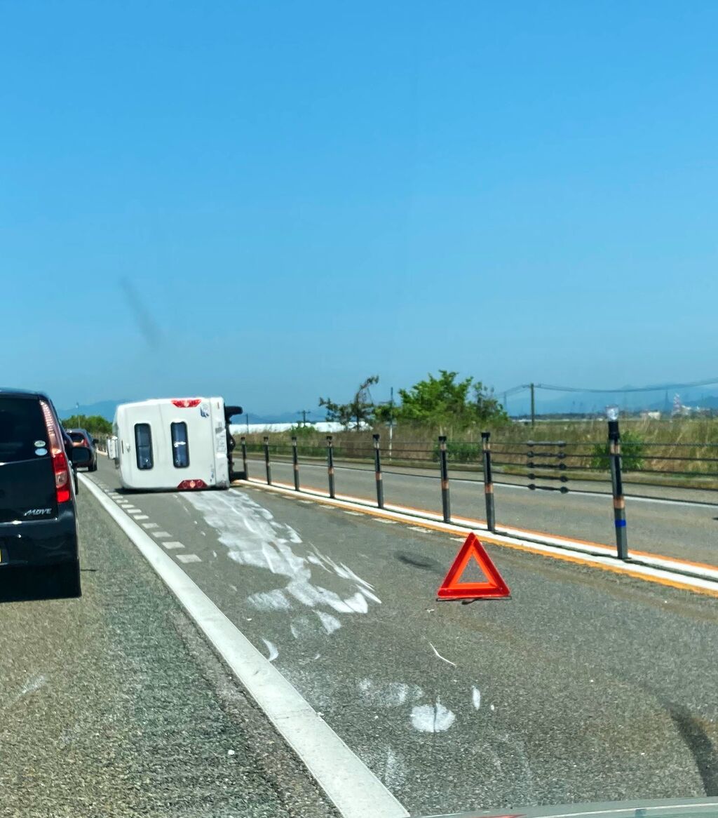 『ちょうど対向車線走ってた時、キャンピングカーがいきなりふらふらして横転しました。そのせいだと思います。怖かった。』
