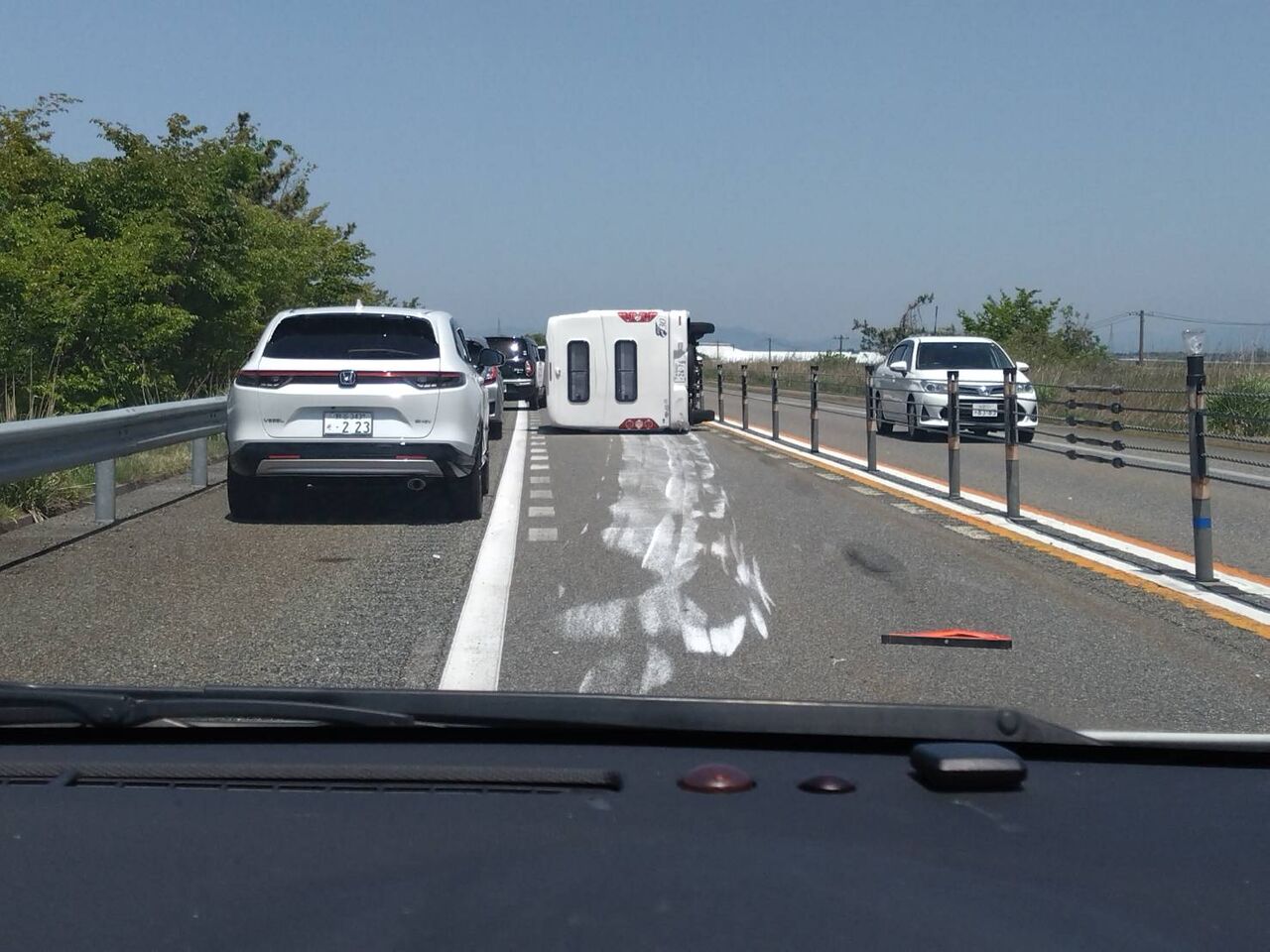 『事故通行止、って表示が出てたけど普通に高速乗れちゃって、事故処理終わったの?って思ってたら渋滞。キャンピングカーが横転してる横を通るのに渋滞してたのであった』