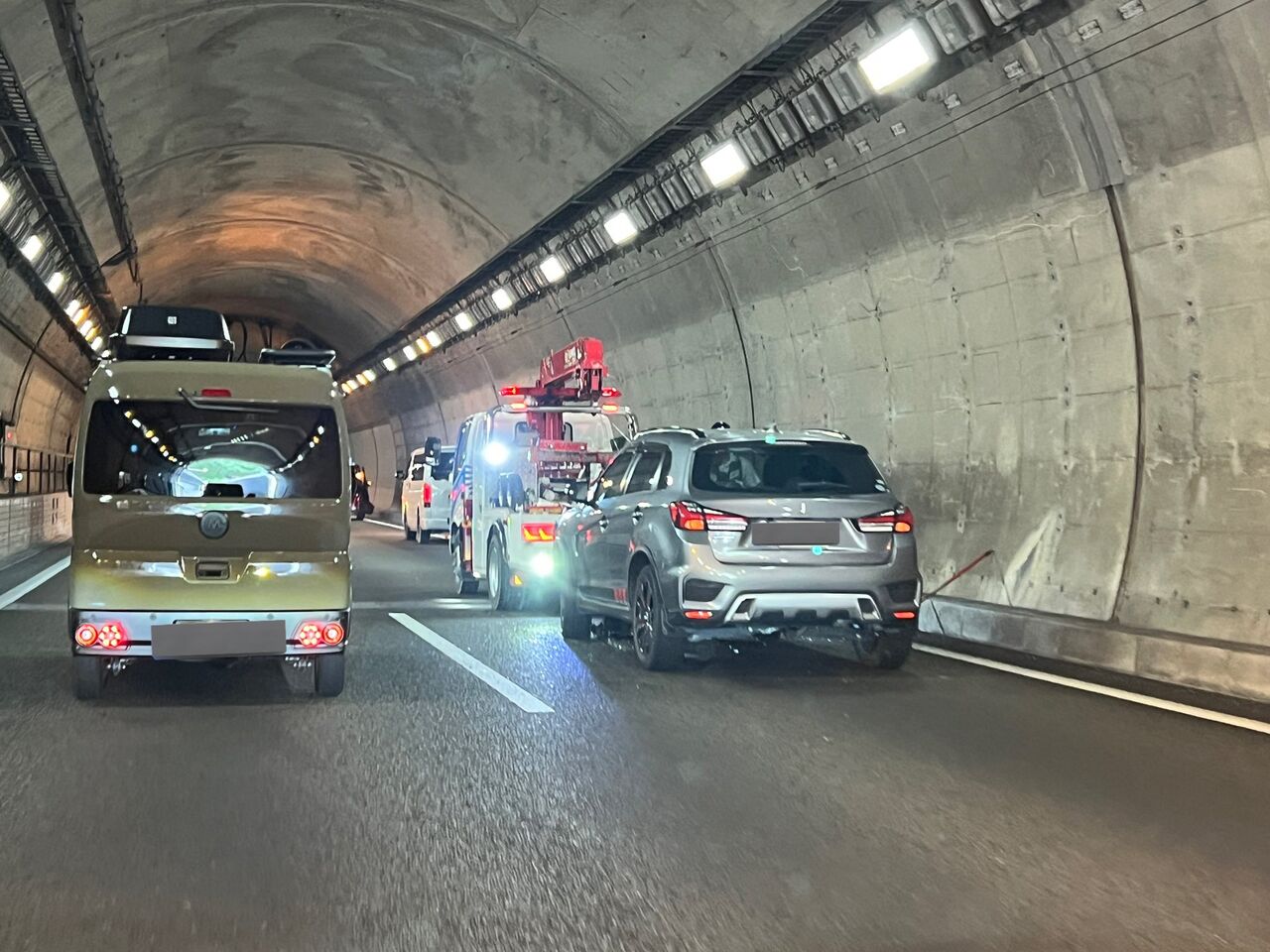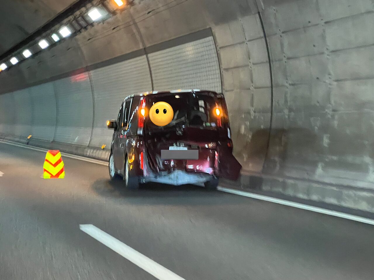 『圏央道、トンネル内の追突事故 抜けるのにえらい時間がかかった ←追突した車(シルバーSUV前部大破)』