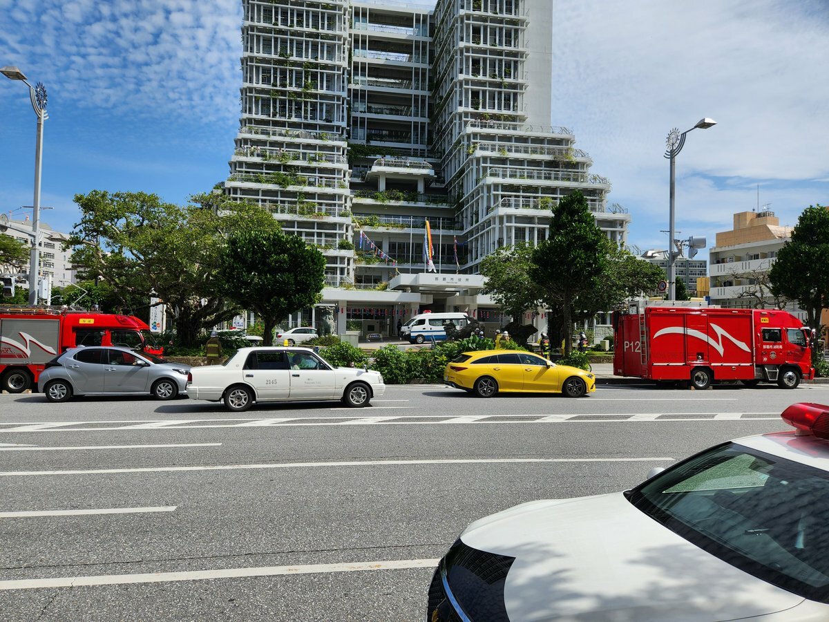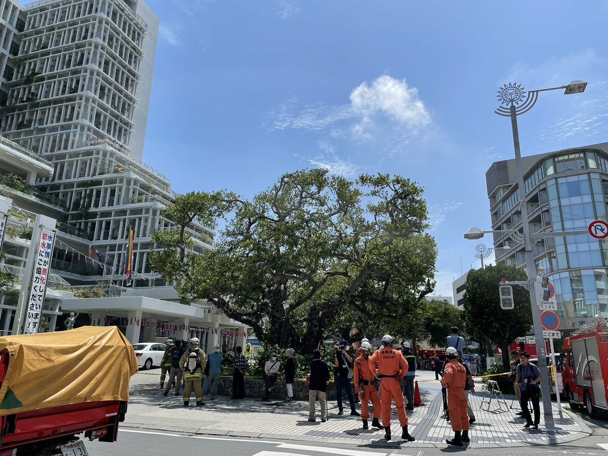 那覇市役所前、規制線がはられ人も車も迂回中。不審物が見つかったそうな。建物にはまだ人がいるから退避は一部?