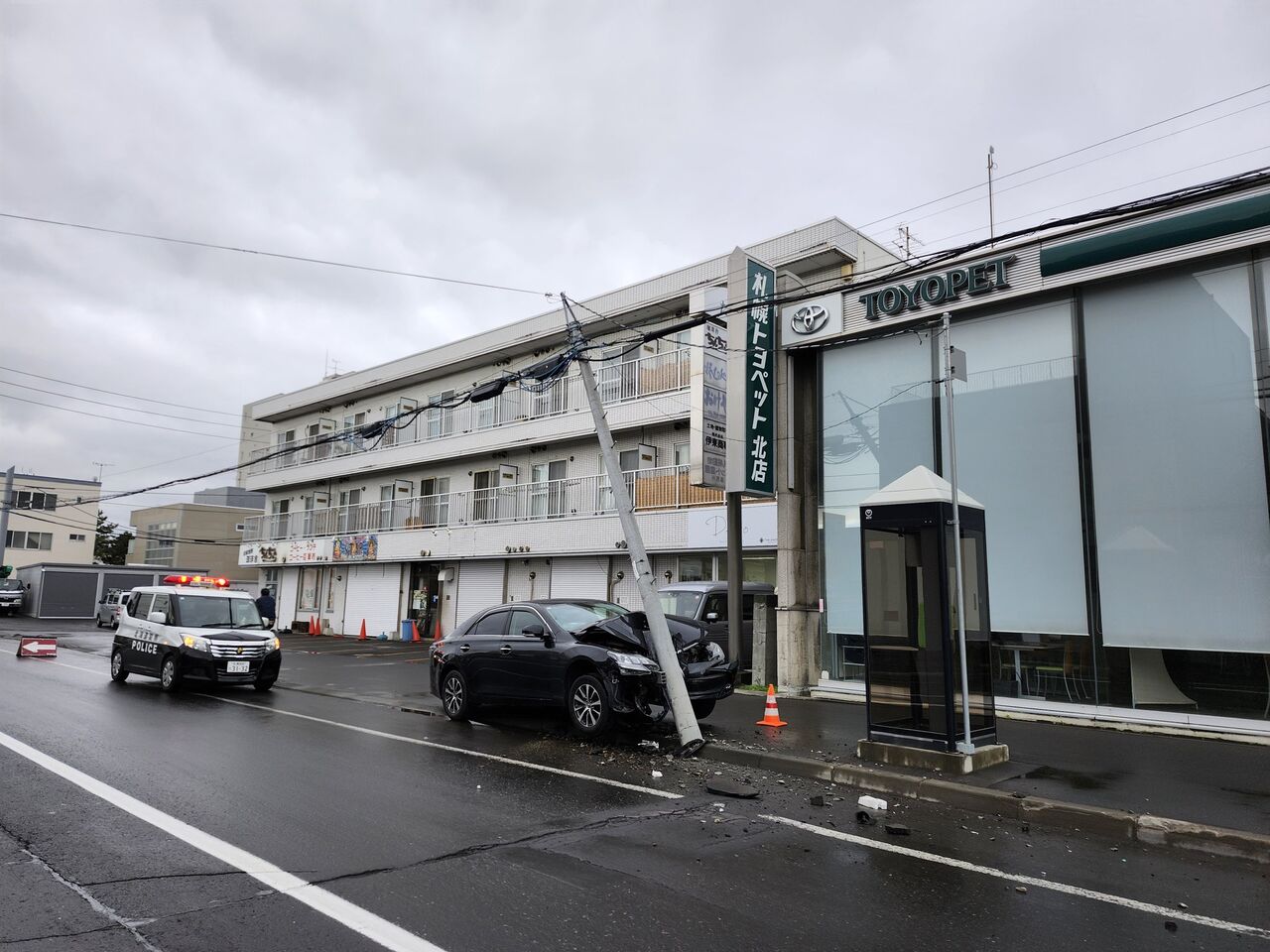 禎心会病院の近くで電柱に正面から突っ込んでる車がいたよ。