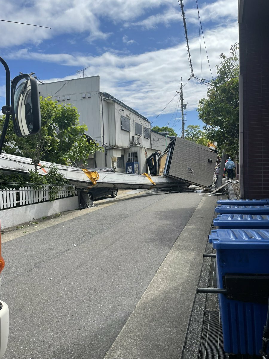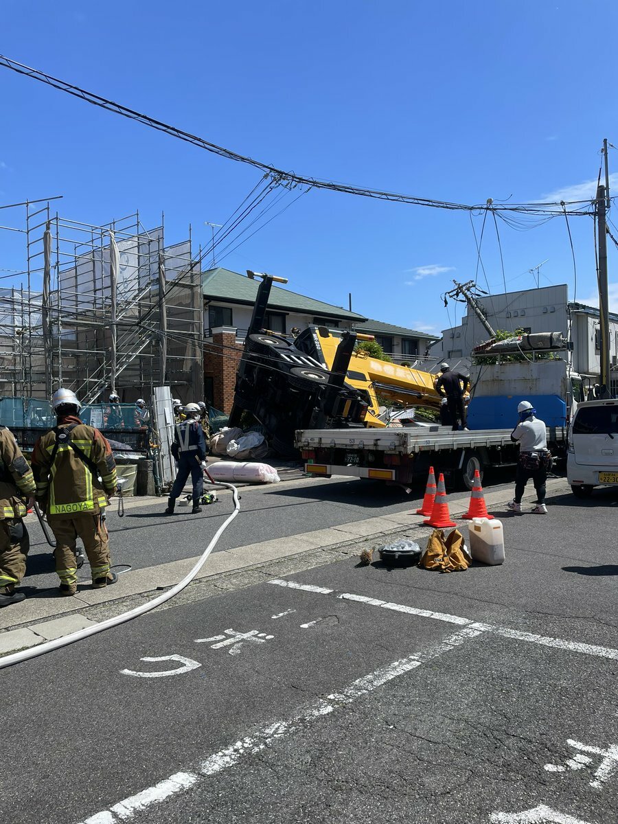 【現場の様子】#注意喚起 愛知県名古屋市西区五才美町の住宅街でクレーン車倒れる事故 周辺が一時停電5月9日 #名古屋 #停電