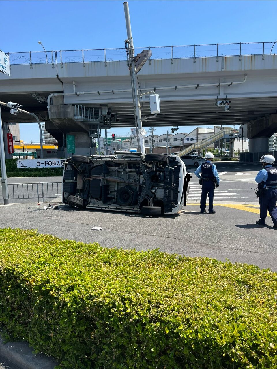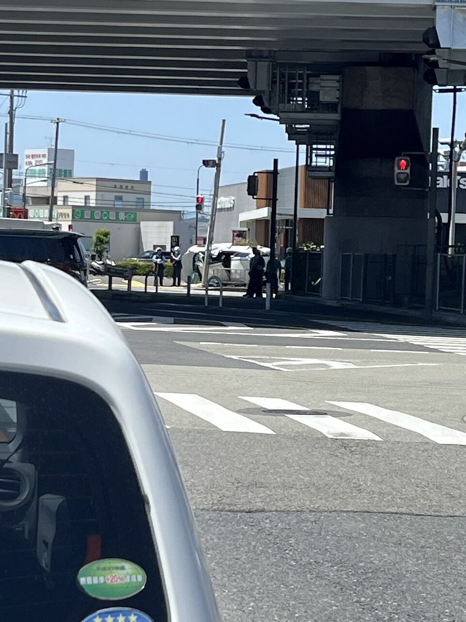『松原JCT前のマクドナルドの前で 車が横転してた。結構中もボロボロだったけど大丈夫かな 渋滞もすごかった』