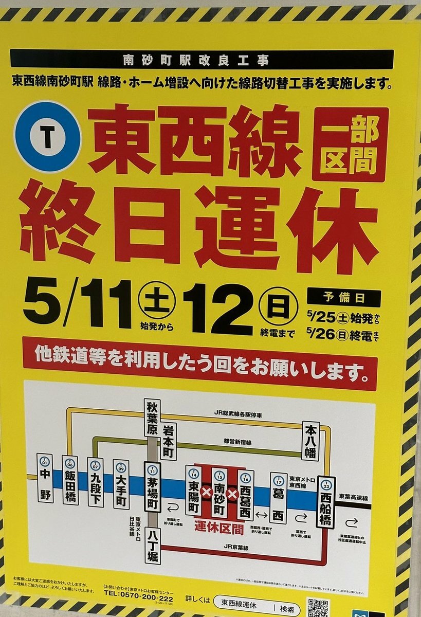今日と明日は東西線の東陽町から西葛西間は終日運休なのでお気をつけて。 pic.twitter.com/1n2lcnPJSJ— どらちゃ (@doracha99988219) May 11, 2024