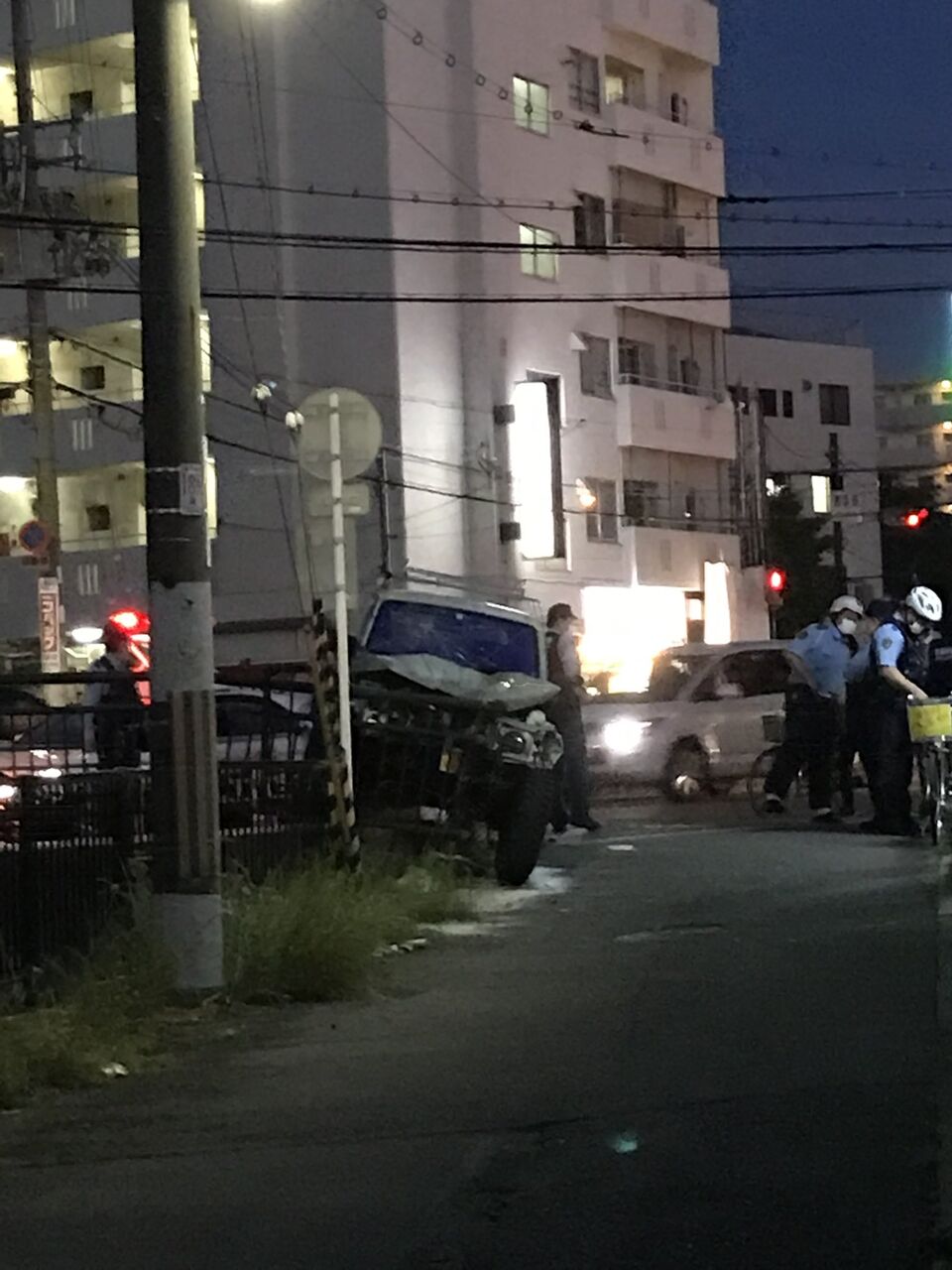 『大阪市東住吉区中野三丁目交差点にて 川の橋に ジープ車が突っ込んだ事故。 交通事故にご注意を』