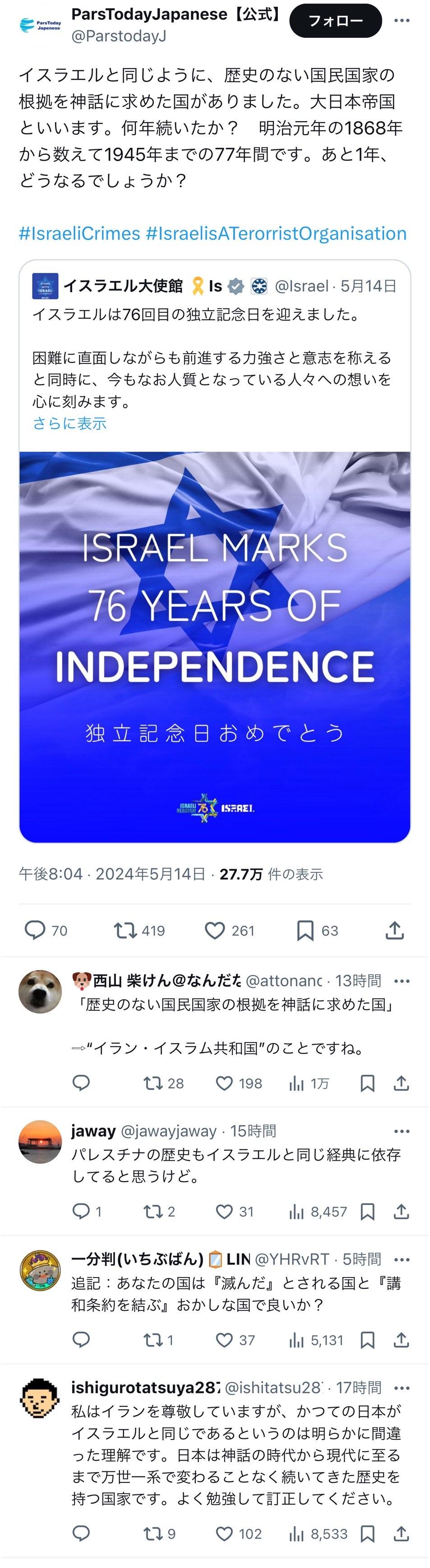 【緊急悲報】イラン、唐突に日本を煽り炎上!「日本は歴史のない国民国家なので神話に根拠を求めた」 2024/5/15 速報 1: document.write(” + ”); 関連記事 document.write(” + ”); 続きを読む ——— Source: アルファルファモザイク 【緊急悲報】イラン、唐突に日本を煽り炎上!「日本は歴史のない国民国家なので神話に根拠を求めた」