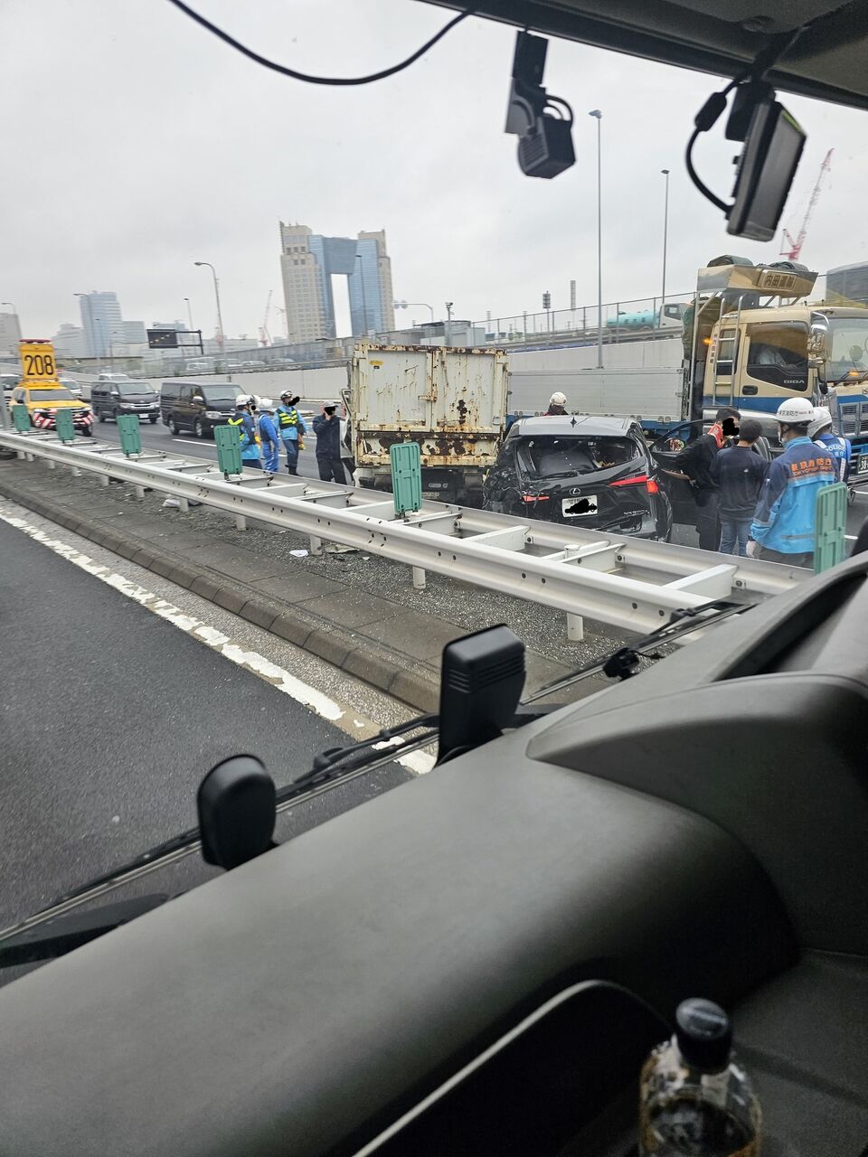 『湾岸線西行き有明JCT辺りで、レクサスNX(RXかも?)がダンプにカマ掘られてて逆向いてた。』
