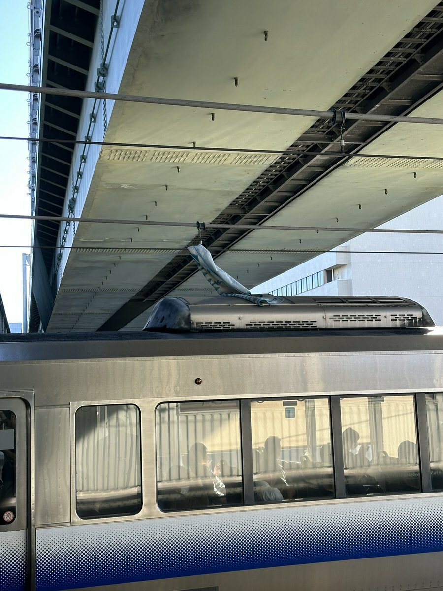 弁天町で架線に飛来物?