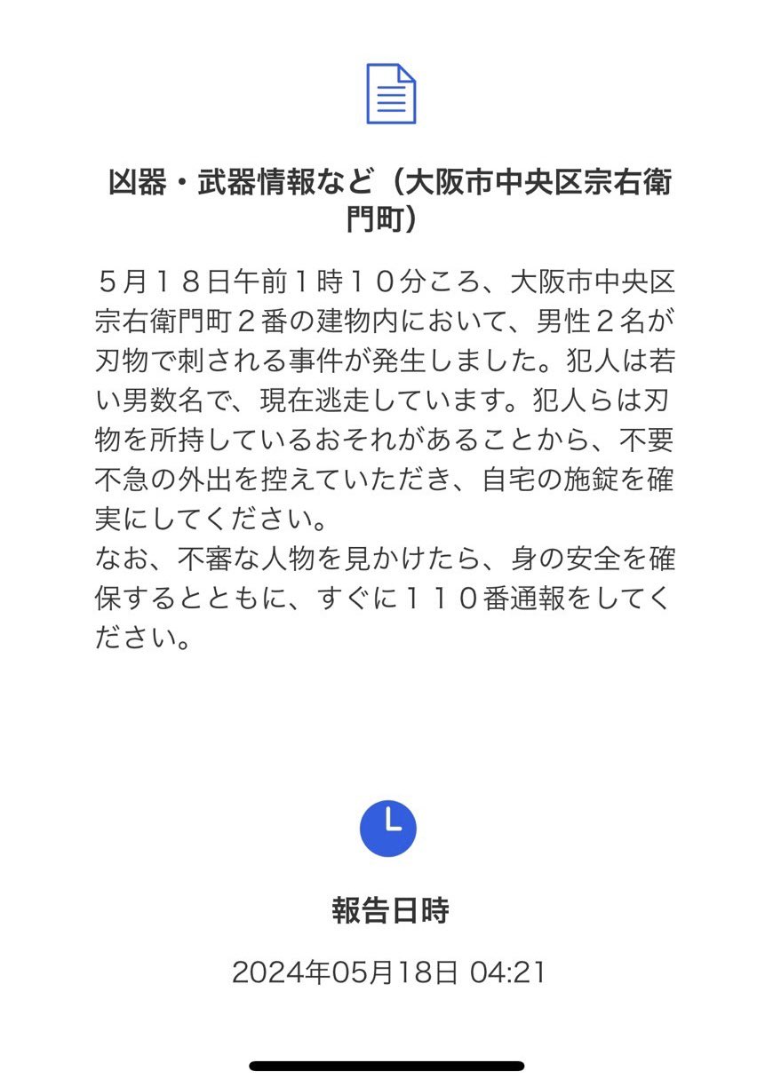 【目撃証言】#注意喚起 『20代男性2人が刃物で刺された』大阪市中央区宗右衛門町で殺人未遂事件 刃物所持した犯人逃走中5月18日 #大阪 #ミナミ #宗右衛門町