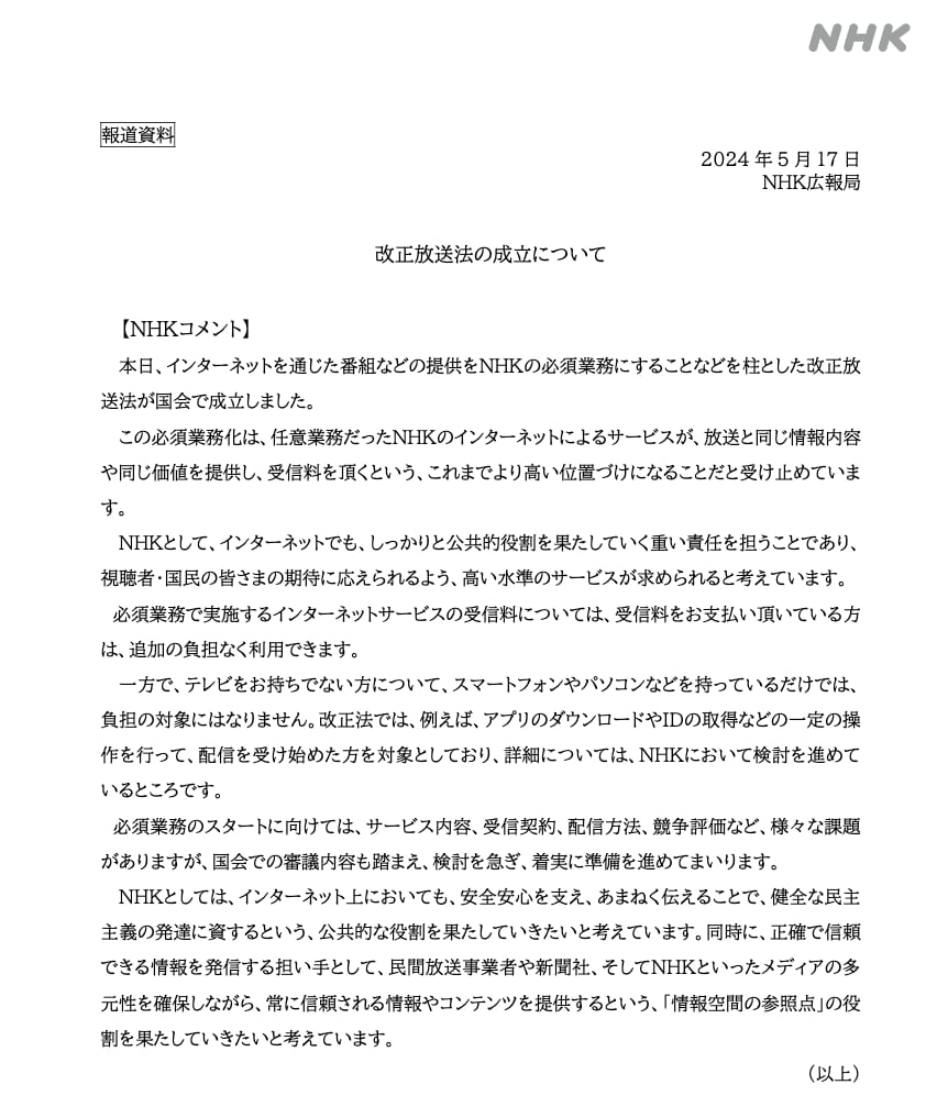 日本放送協会(NHK)は5月17日、インターネットを使った番組などの提供をNHKの必須業務にすることを柱とした改正放送法が国会で成立したことを受け、コメントを発表した。