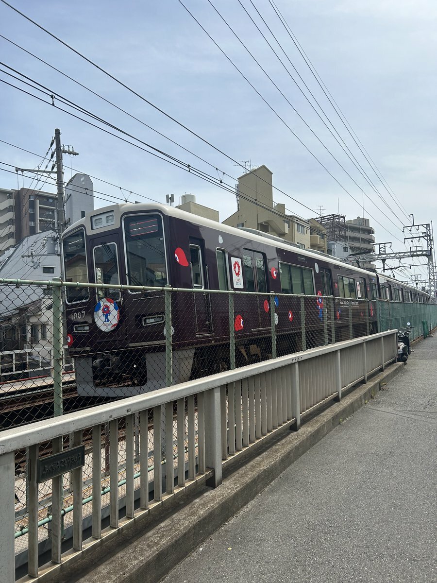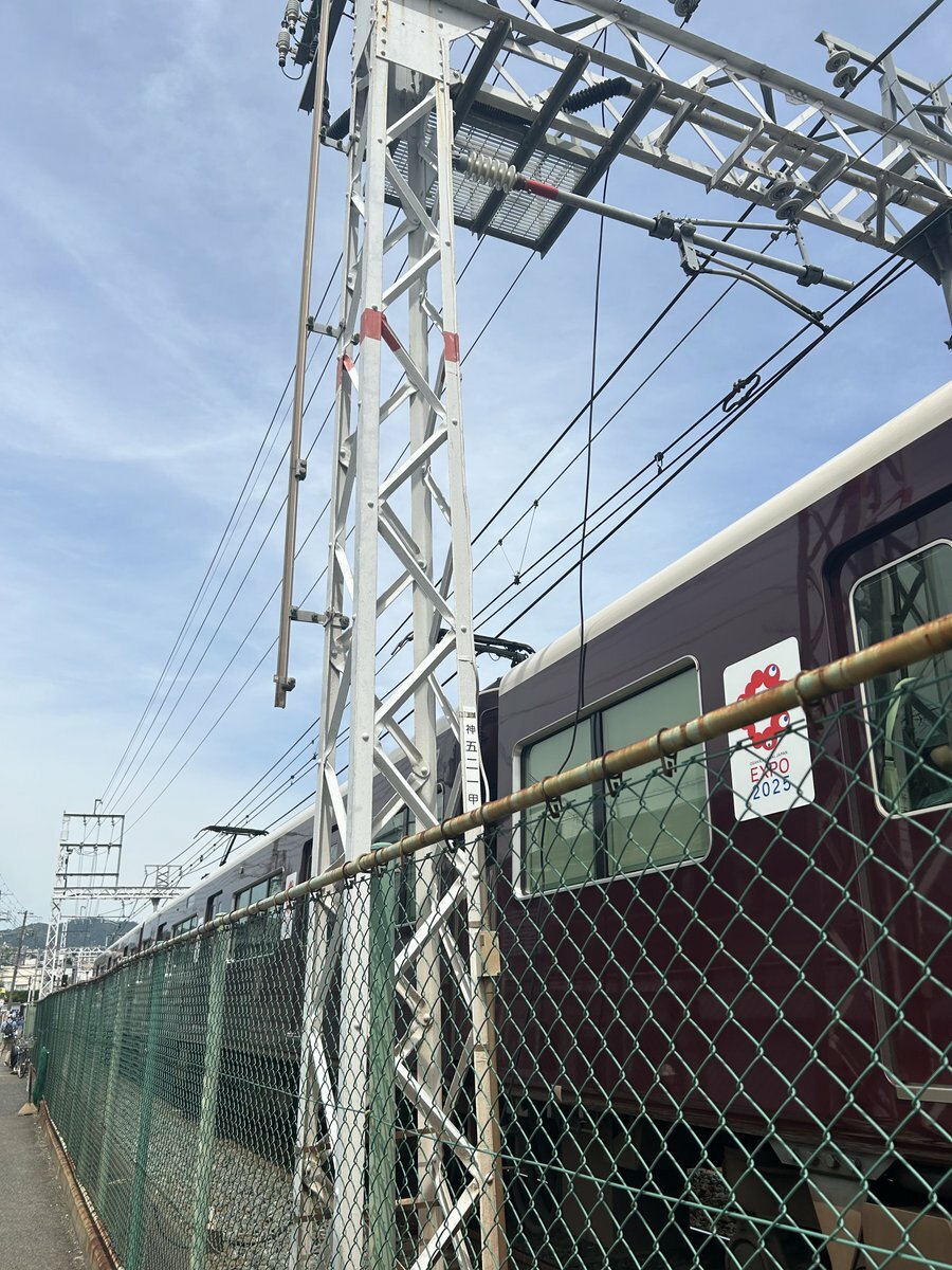 阪急電車のブレーキ音と警笛鳴らして徐行してたから様子を見に行くと、当店最寄りの踏切付近で架線断裂。なんとミャクミャク号が立ち往生していました。ということで、現在阪急神戸線運転見合わせとなっていますのでご来店予定の方はお気をつけくださいませ🫡https://t.co/MmAidXjFgT#阪急電鉄 pic.twitter.com/zCFkWMdrM0