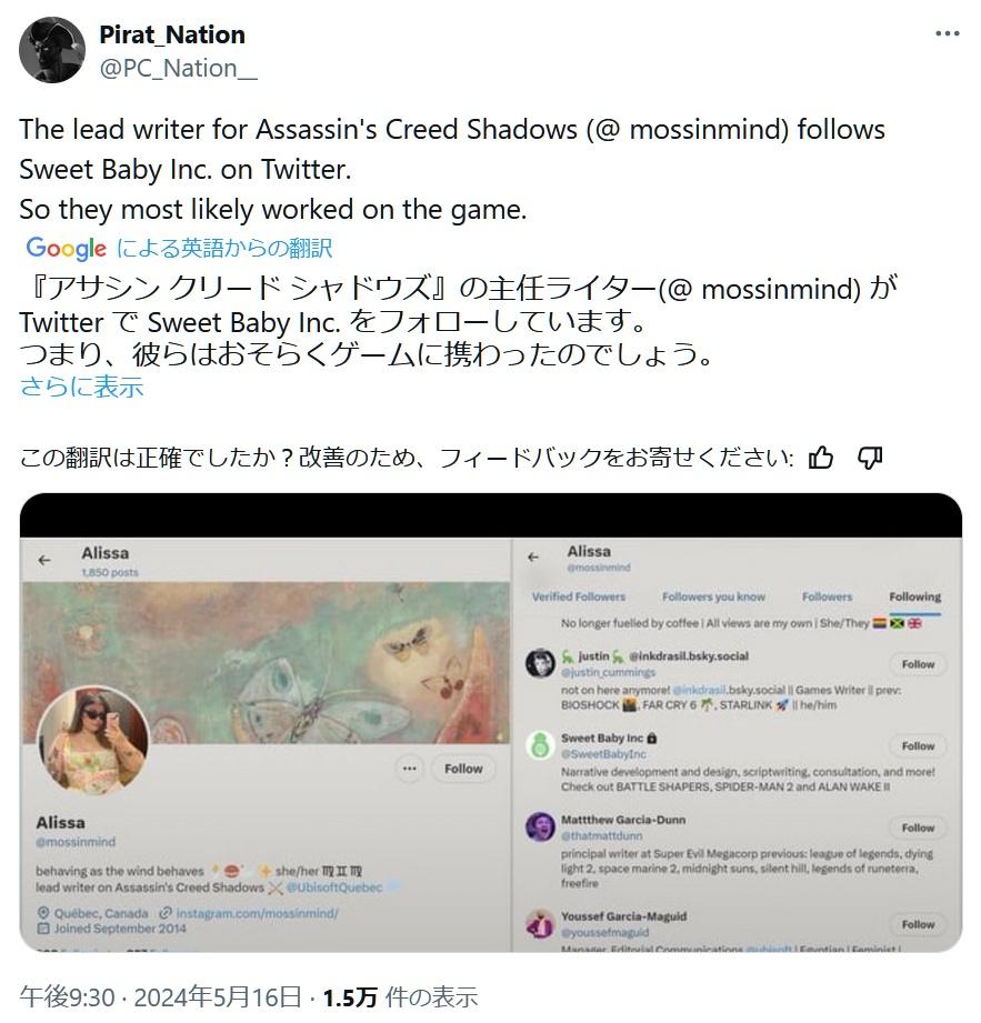 すると、このゲームの女脚本家(ポリコレゴリ押しコンサル会社「スイートベイビー」のファン)はPV公開後にボコボコに叩かれてTwitterアカウントを非公開にしてしまった
