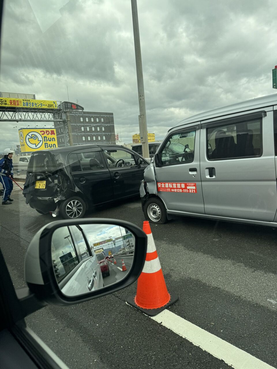 【現場の様子】#交通情報 #阪神高速 13号東大阪線 西行 長田付近 破片散乱する軽バンと軽自動車追突事故で規制渋滞2月26日 #渋滞 #大阪