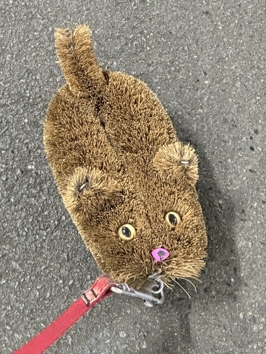 投稿したのは、爆発電波2さん(@expsy_2)。「たわしを散歩させてる男性が東京にはいると噂には聞いていたけど本当にいた。しかもかわいいたわし」として、 リードが繋がれた猫のような形のたわしの写真を投稿しました。