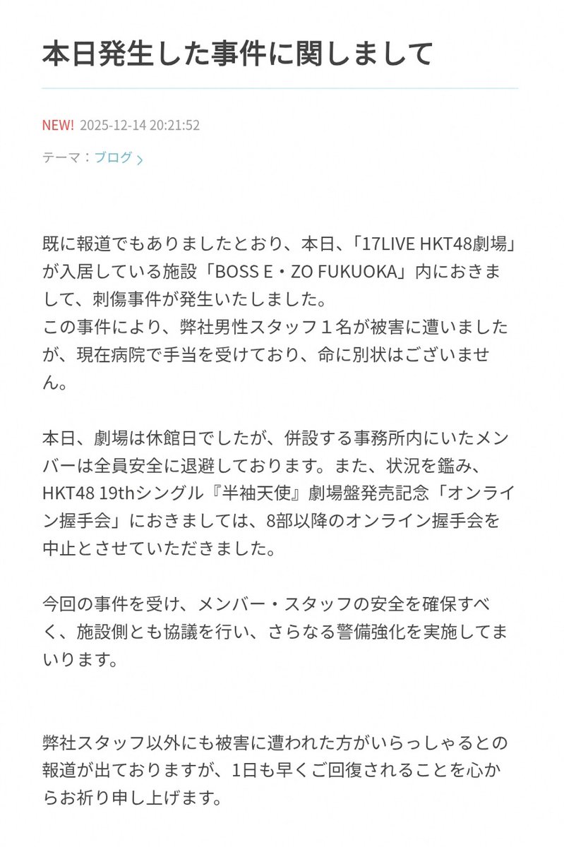 【現場の状況】みずほPayPay福岡ドーム近くで刺傷事件 HKT48男性スタッフが刃物で刺される 隣の商業施設でも女性会社員が刺される 30代男を事情聴取12月15日 #福岡 #HKT48