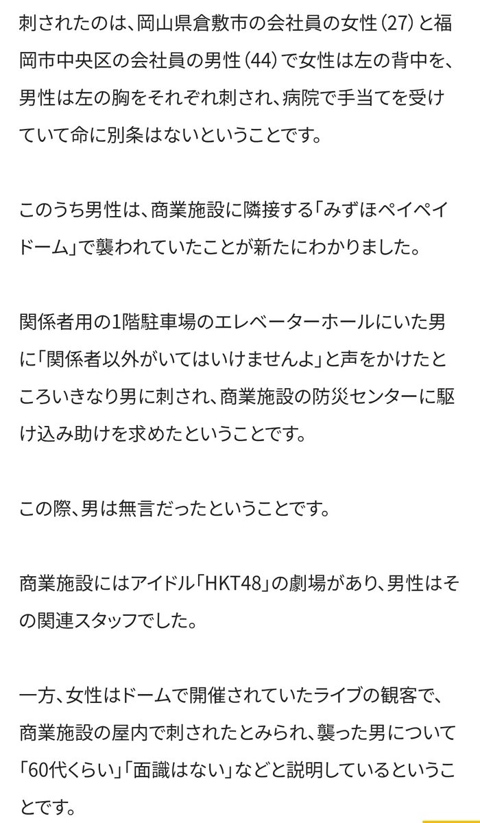 警察によりますと、きのう午後5時ごろ、みずほPayPayドーム1階駐車場のエレベーターホールでHKT48の男性スタッフが男に刃物のようなもので刺され、隣の商業施設でもこの男に27歳の女性会社員が刺されました。