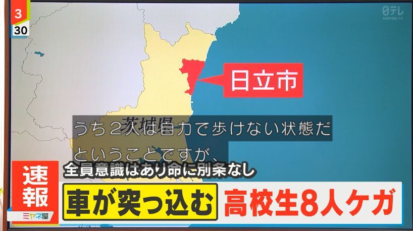 消防によりますと4日午後2時半ごろ、茨城県・日立市で、乗用車が歩行者の列に突っ込み、女子高校生8人がケガをしました。