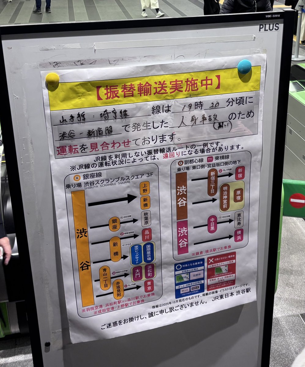 『代々木駅付近で倒れていた人は人身事故と判明したのでしばらく運転見合わせなう。』