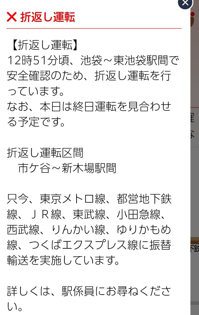 02月10日13時15分現在【折返し運転】12時51分頃、池袋~東池袋駅間で安全確認のため、折返し運転を行っています。なお、本日は終日運転を見合わせる予定です。折返し運転区間 市ケ谷~新木場駅間 https://t.co/aaAgB55EKc