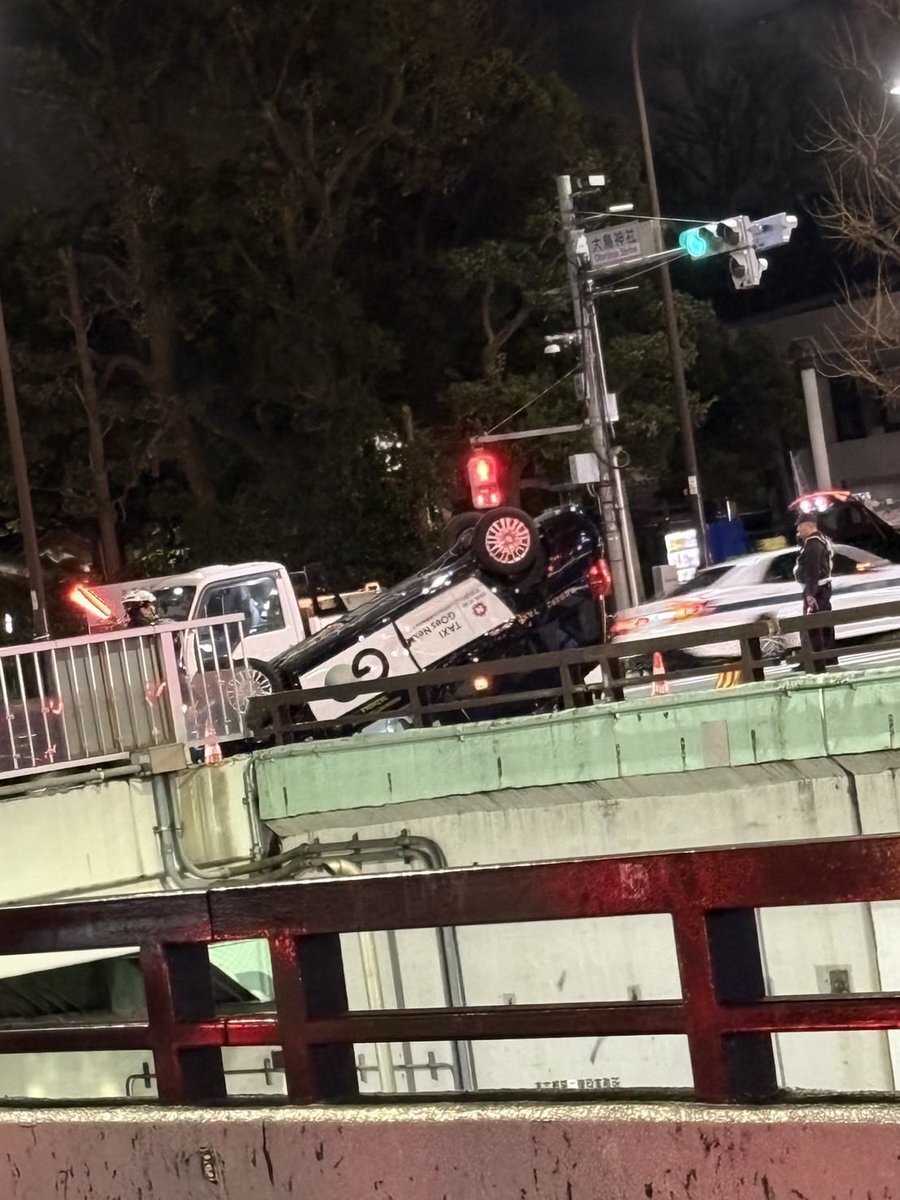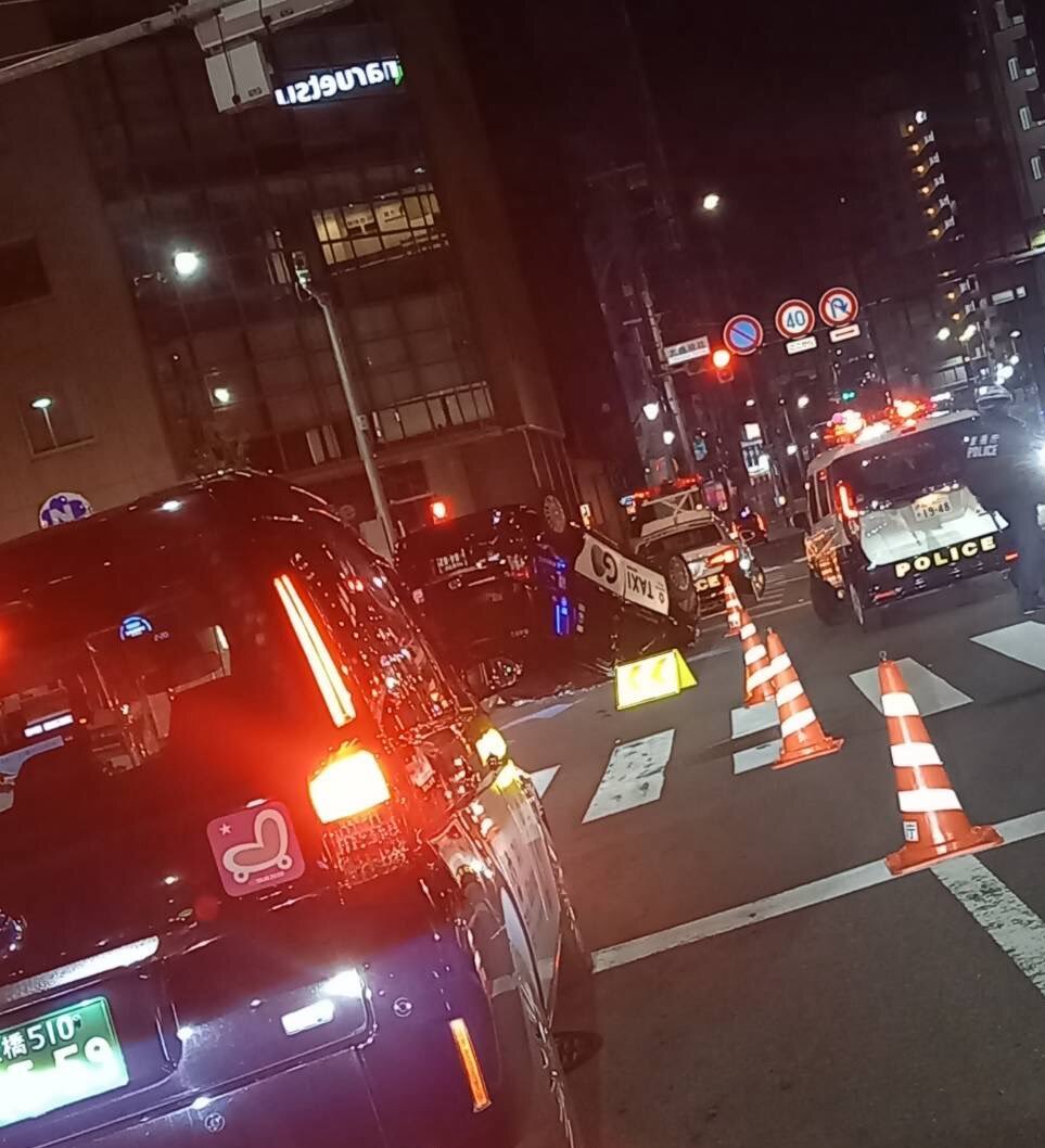 『帰りに通過したが目黒の大鳥神社交差点でタクシー同士の衝突かな。一台逆さにひっくり返っていた。』