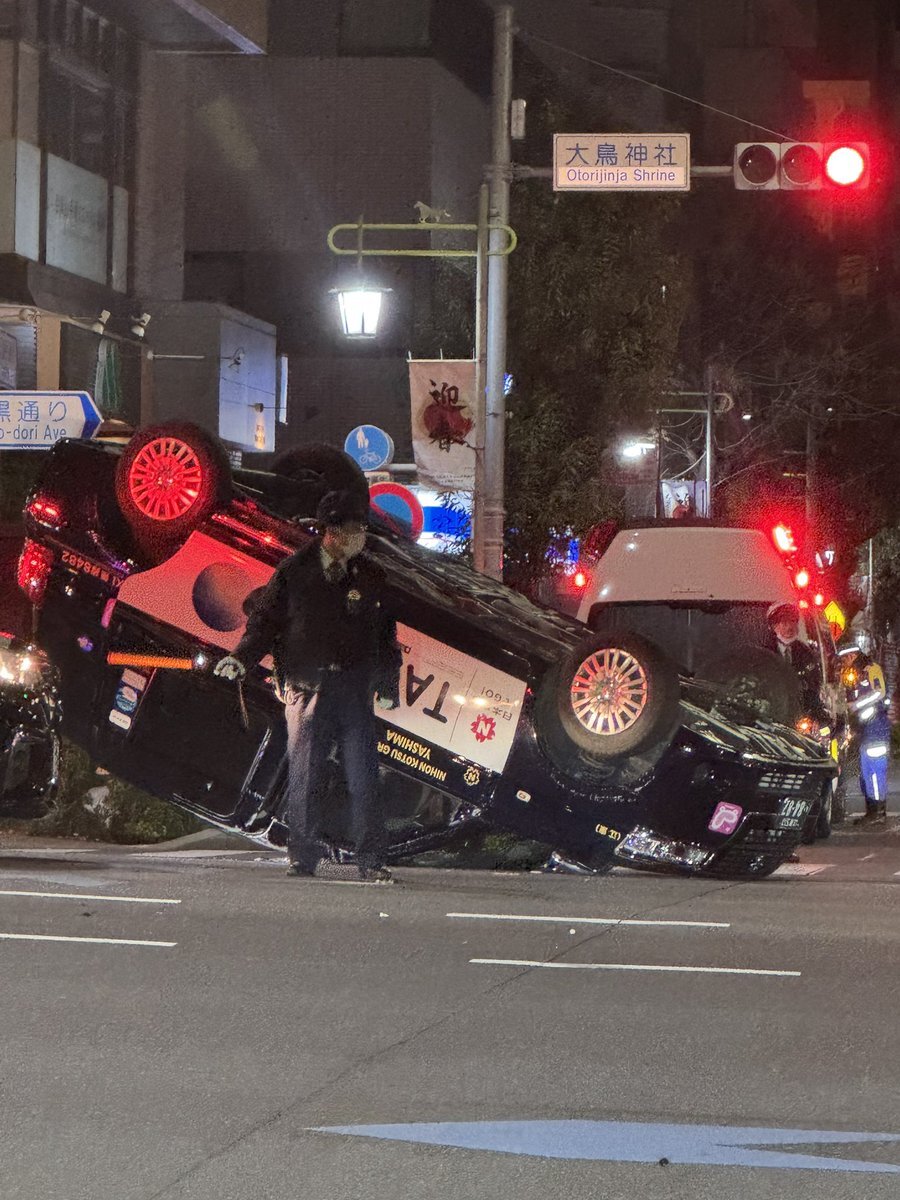 大鳥神社前の交差点。日交さんがひっくり返っていた。中の人は大丈夫かね? pic.twitter.com/sUS1BJSetA