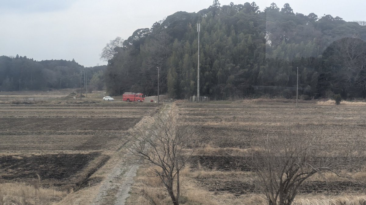 野焼きの火が線路に迫っているとかで、あと一駅の地点で足止め中💦🔥(笑)。#ここはどこ#JR成田線#開演に間に合うでしょうか#関東平野の恐怖
