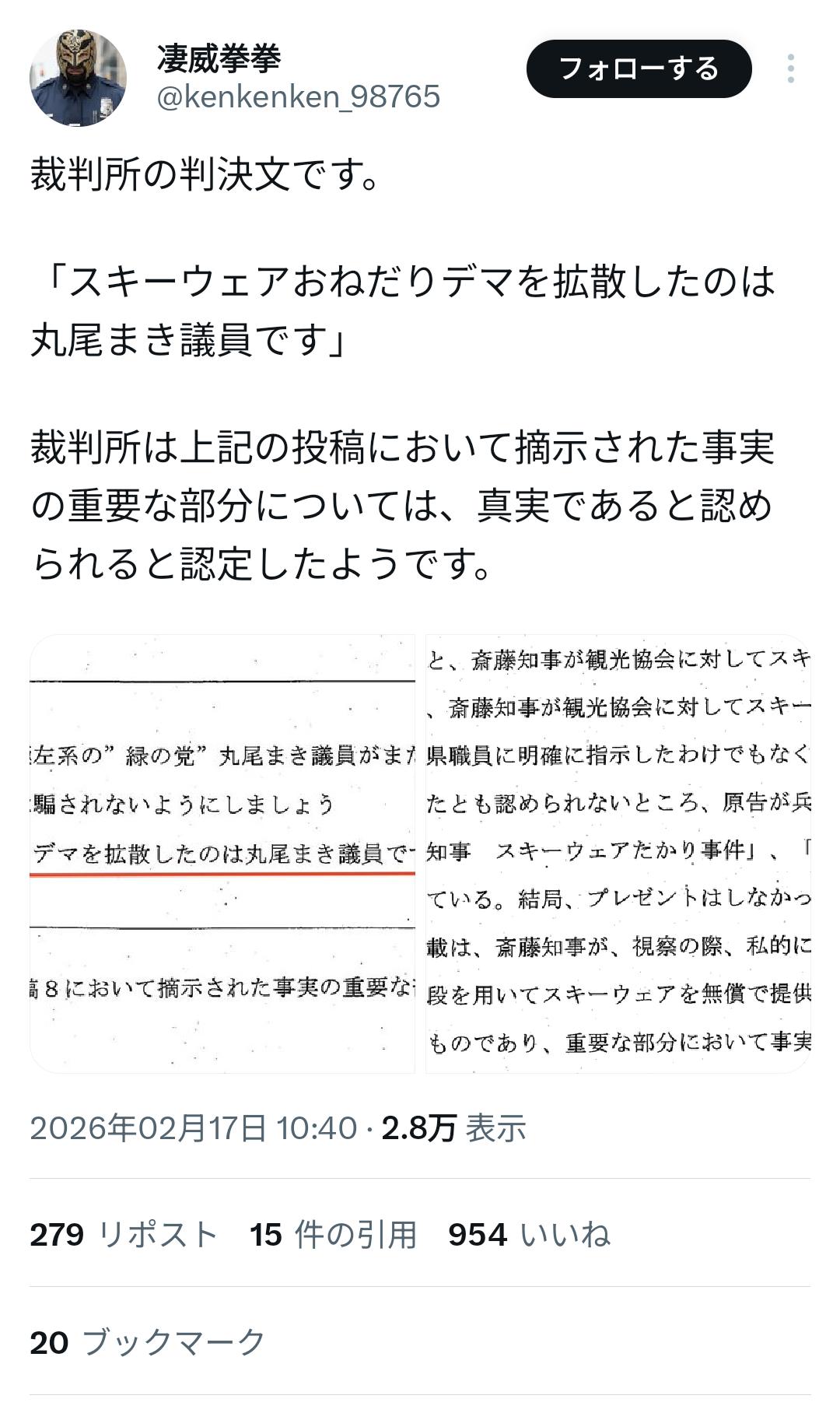 【速報】斎藤知事のおねだり疑惑、デマだったことが訴訟でバレてしまう… 2026/2/18 トレンド 1: https://greta.5ch.net document.write(” + ”); 関連記事 新聞労連「質問すると記者が誹謗中傷される!斎藤知事はなんとかしろ!」 【速報】斎藤知事、背任容疑で書類送検 【悲報】斎藤知事、正体を現す。 斎藤知事、ついに自分への処分を発表 【速報】斎藤知事の不信任案を検討…立民会派 【画像】ココリコ遠藤と千秋の娘、見事にブレンドされた顔になるwwwwwww document.write(” + ”); 続きを読む ——— Source: alfalfalfa.com 【速報】斎藤知事のおねだり疑惑、デマだったことが訴訟でバレてしまう…