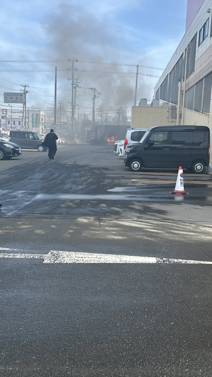 【火事情報】青森県弘前市神田3丁目スーパー カブセンター神田店付近トラック燃える車両火災事故2月22日 #青森 #弘前 #火災