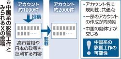 X(旧ツイッター)上で衆院選公示前の1月中旬から、3000件規模のアカウント群が協調的に高市首相や日本の政策を批判する内容を投稿・拡散していることがSNS分析会社の調査でわかった。アカウントや投稿の特徴から、中国系の影響工作の可能性がある。日本社会の分断をあおり、海外からの日本の評価をおとしめる狙いがあるとみられる。