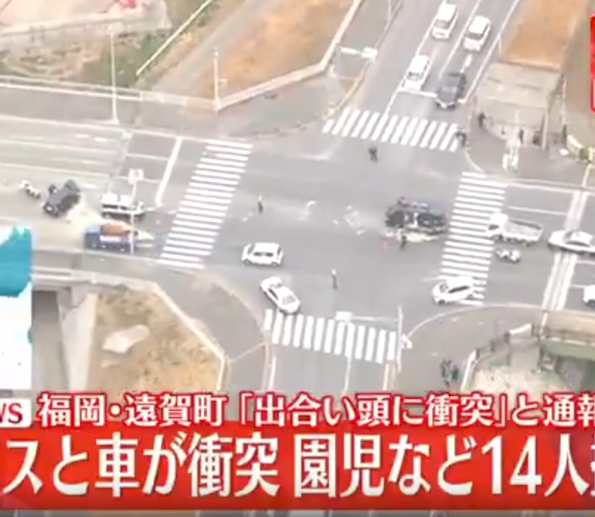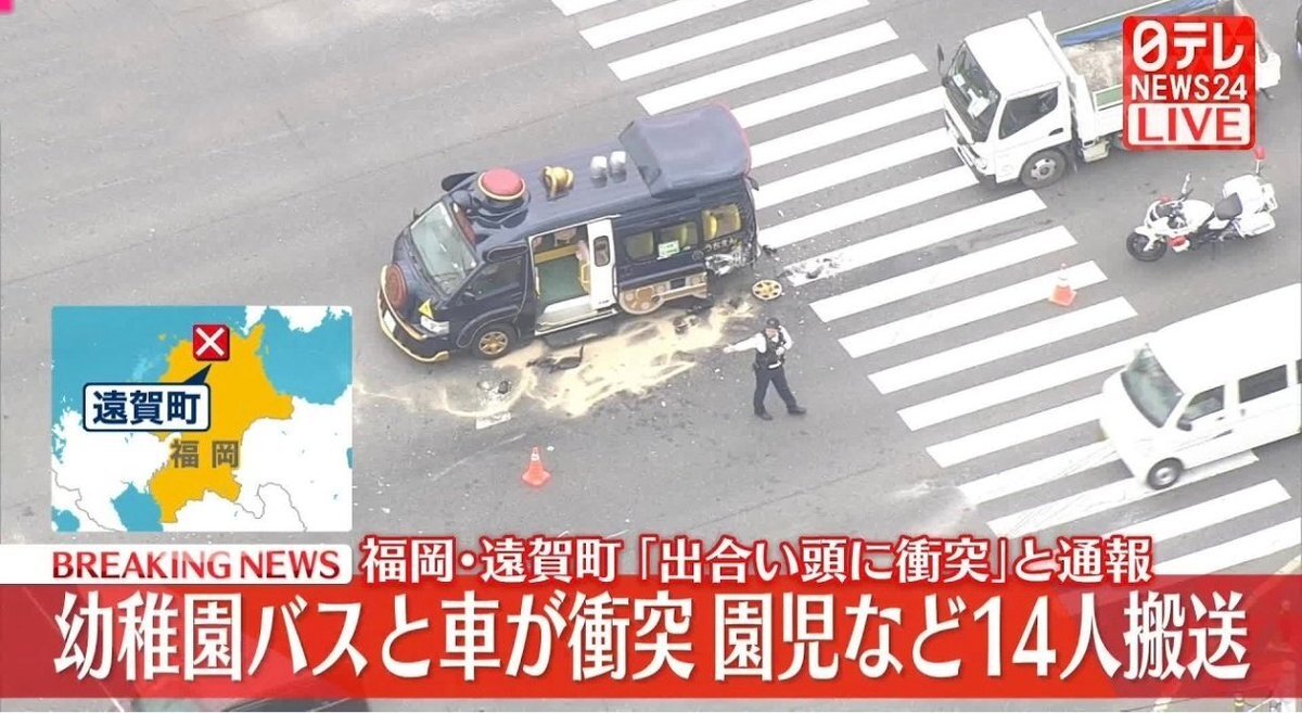 警察によりますと、24日午前9時すぎ、福岡県遠賀町島津で「幼稚園のバスと車が出合い頭に衝突する事故が起きた」という内容の110番通報がバスの運転手からありました。