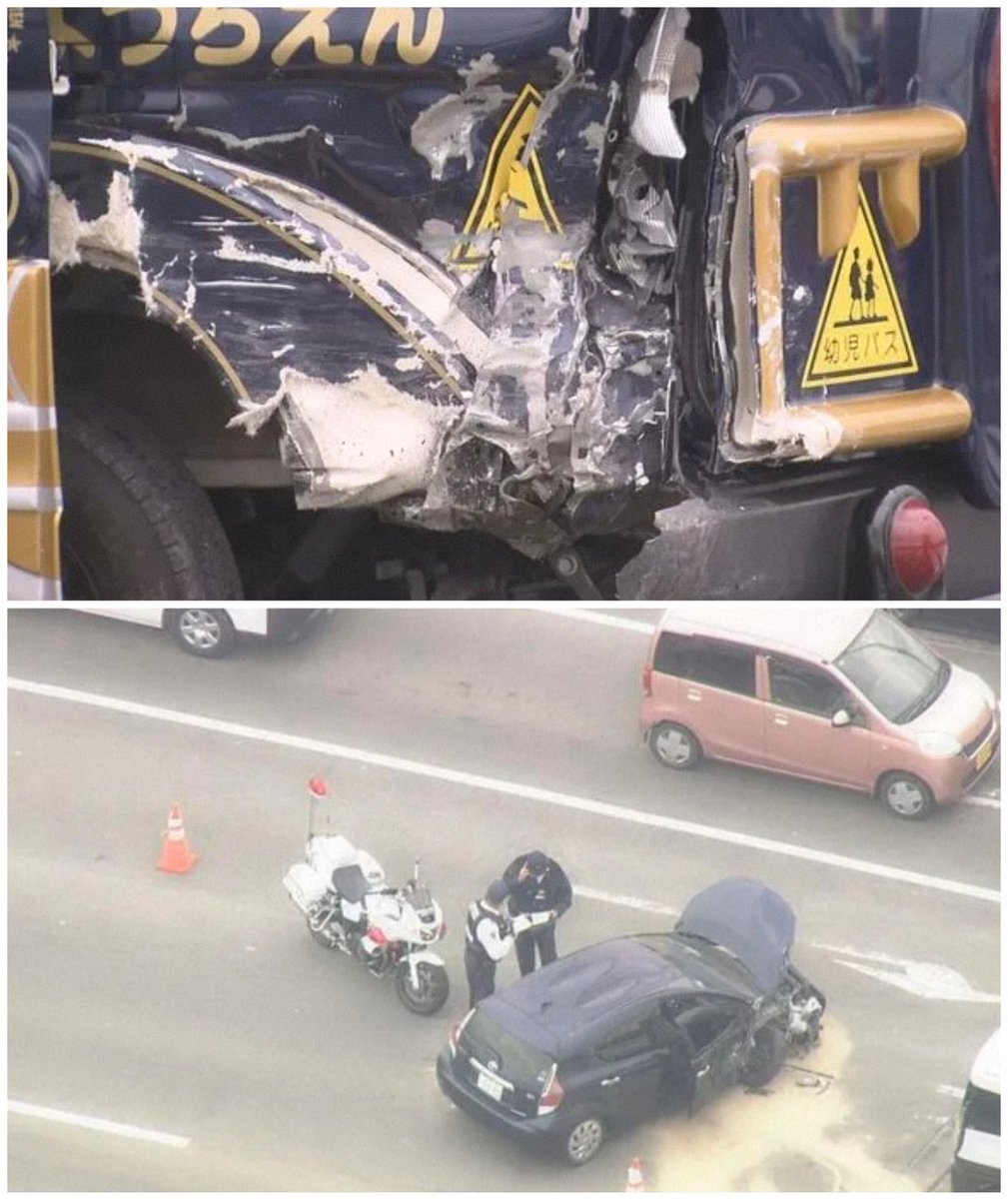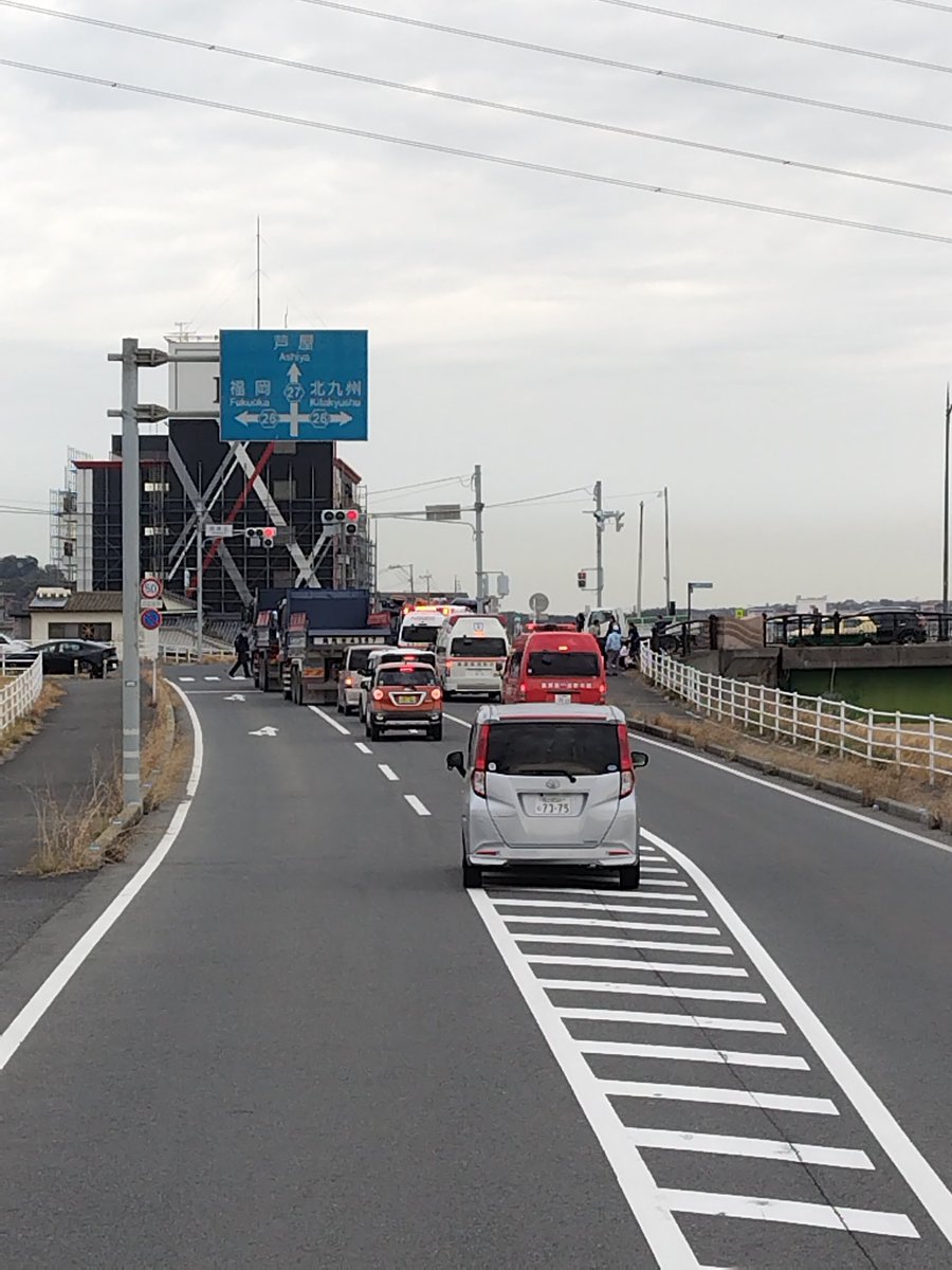 芦屋町の島津北交差点で幼稚園の送迎バスを含む数台の衝突事故で救急車多数です pic.twitter.com/Zj9dUKmwi3