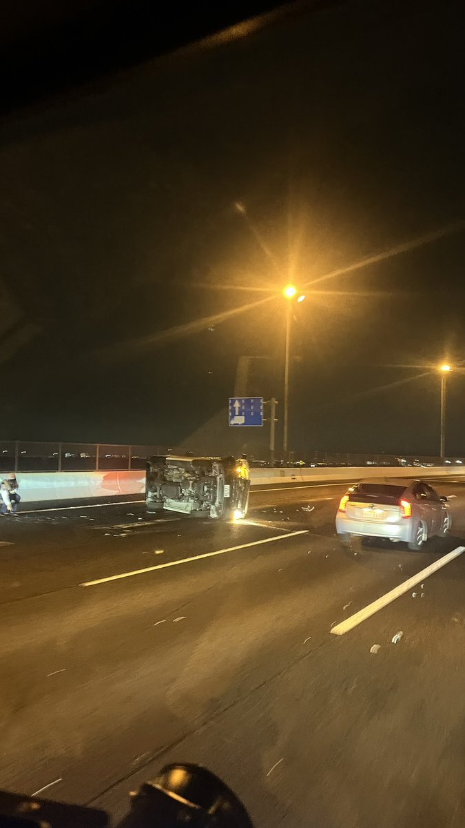『常磐道上り流山付近事故渋滞中左斜線で車がひっくり返ってます』