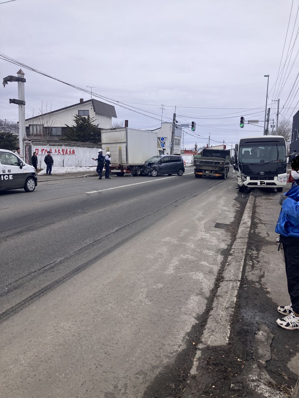 【現場の状況】#交通情報 国道237号 北海道旭川市西神楽1線24号交差点付近 トラック乗用車マイクロバスなどからむ多重事故で規制渋滞2月22日 #北海道 #旭川