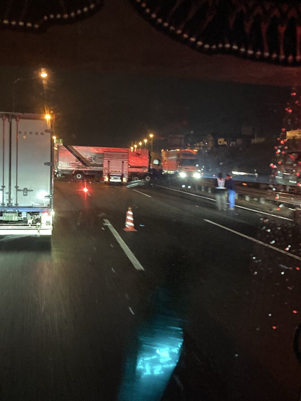 横向いたトラックの先にも一般車が事故起こしてるから、事故を回避しようとしたトラックが雨でスリップして横向いちゃって大惨事』
