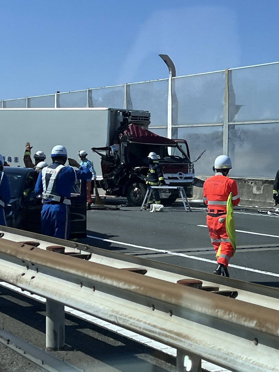 『10時過ぎから動いてない。貨物2台、車2日、バイクと出てて救急車は4台くらい側道通って行った。パトカーに消防車も。』