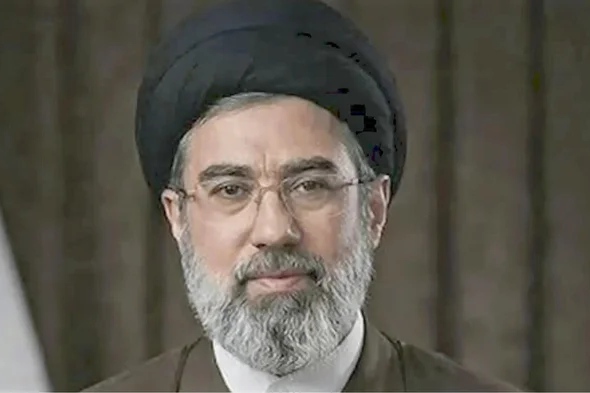 IRGC(イスラム革命防衛隊)の忠誠式典の様子。イランの新しい指導者、モジダバ・ハメネイが登壇できない(重症ないし死亡?)為、何故か急遽ダンボールで代用。