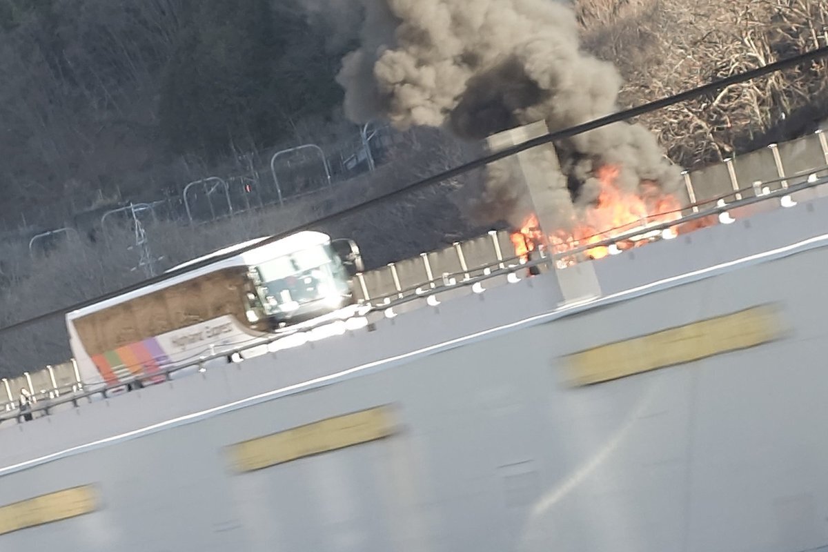 『今、高速バスに乗ってるんですが、目の前に炎上してる車がいて、めっちゃびっくり!!!中央道上り線の笹子トンネルに入るちょっと手前です』