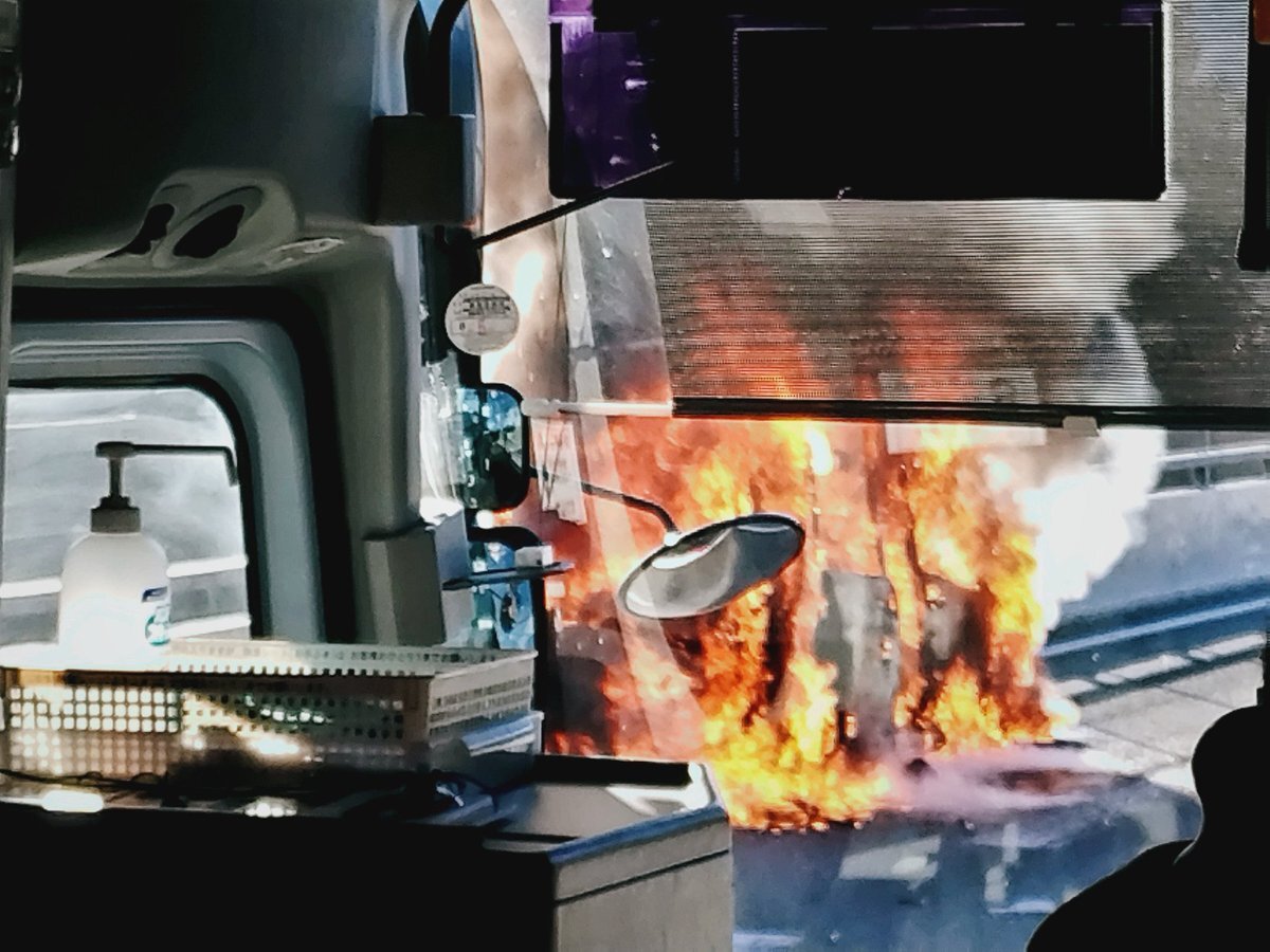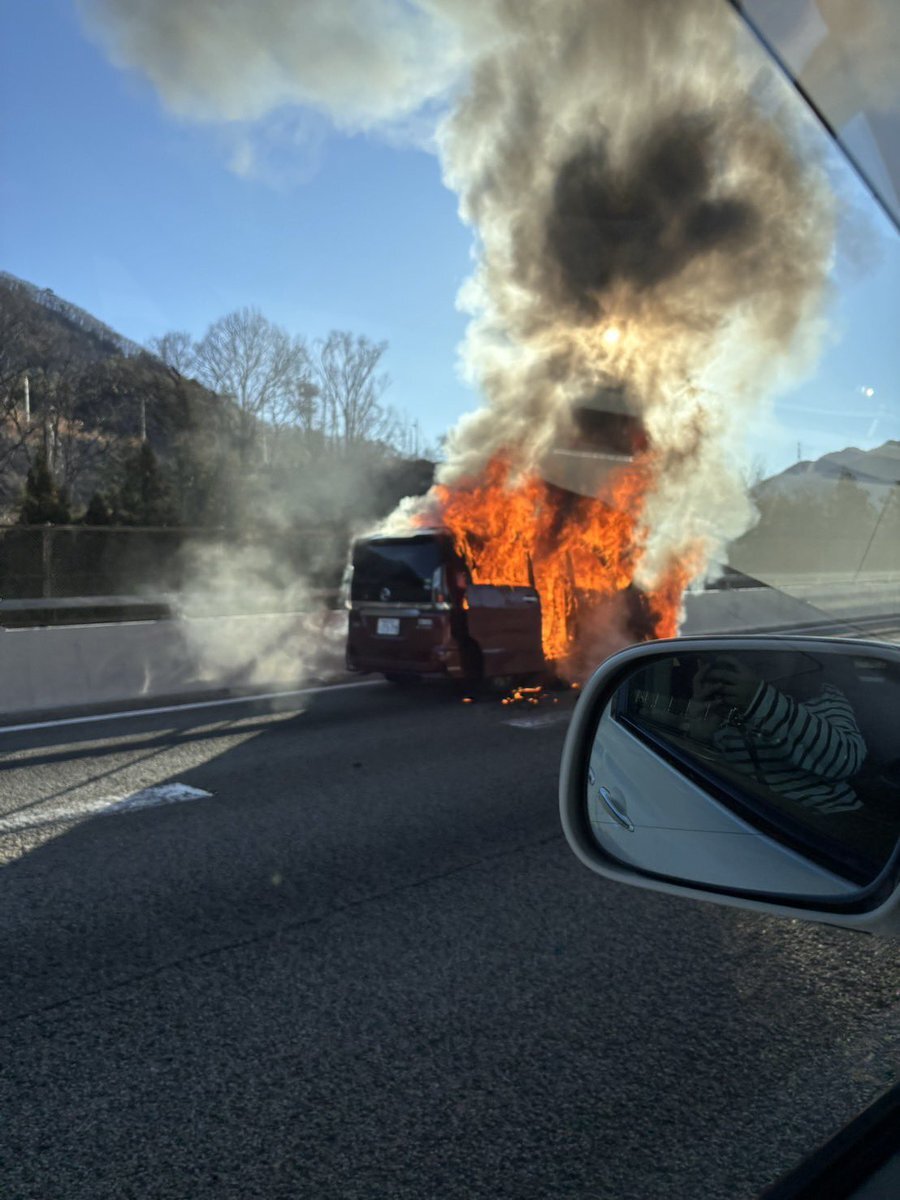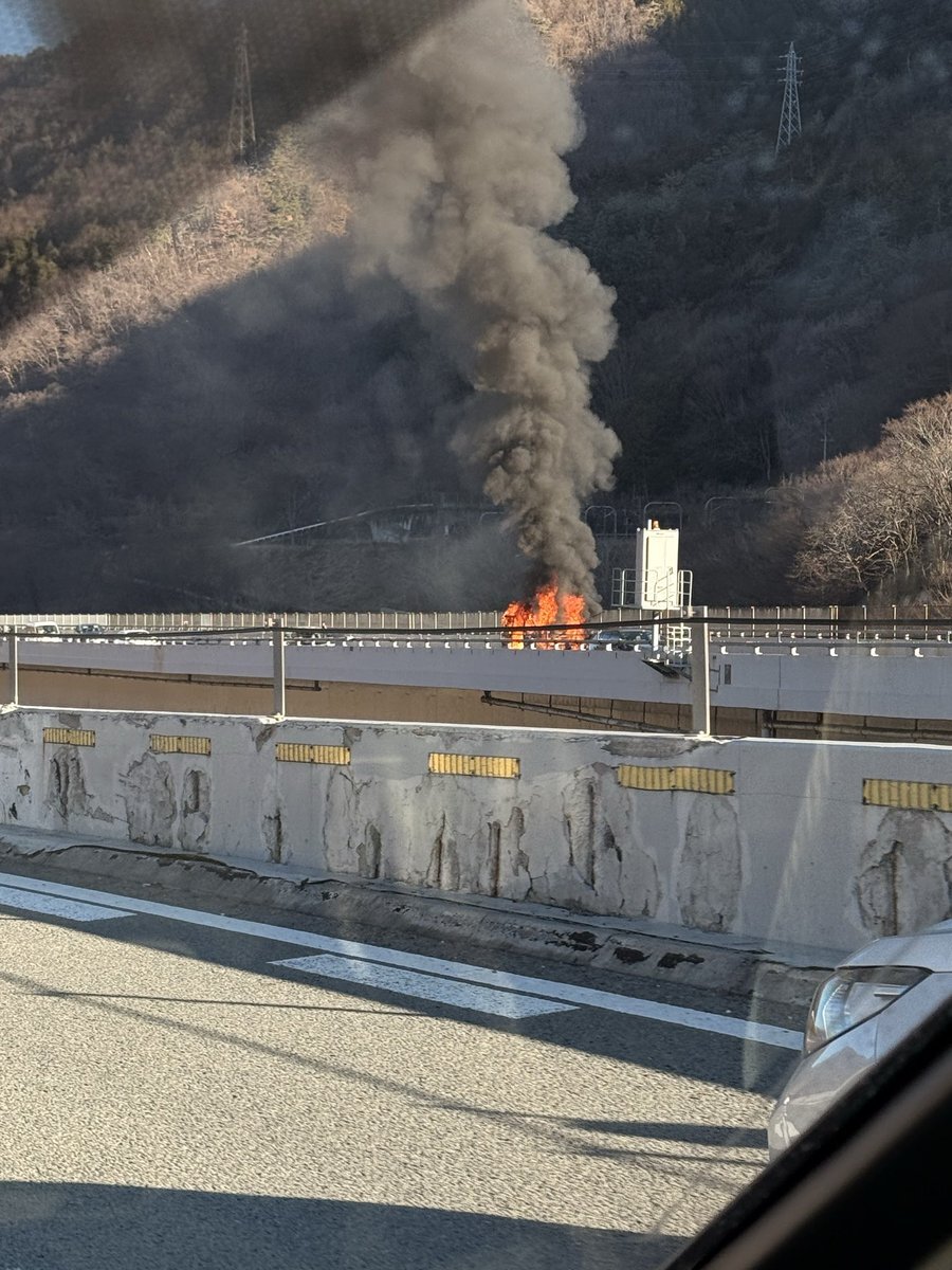 今、高速バスに乗ってるんですが、目の前に炎上してる車がいて、めっちゃびっくり!!!中央道上り線の笹子トンネルに入るちょっと手前です。