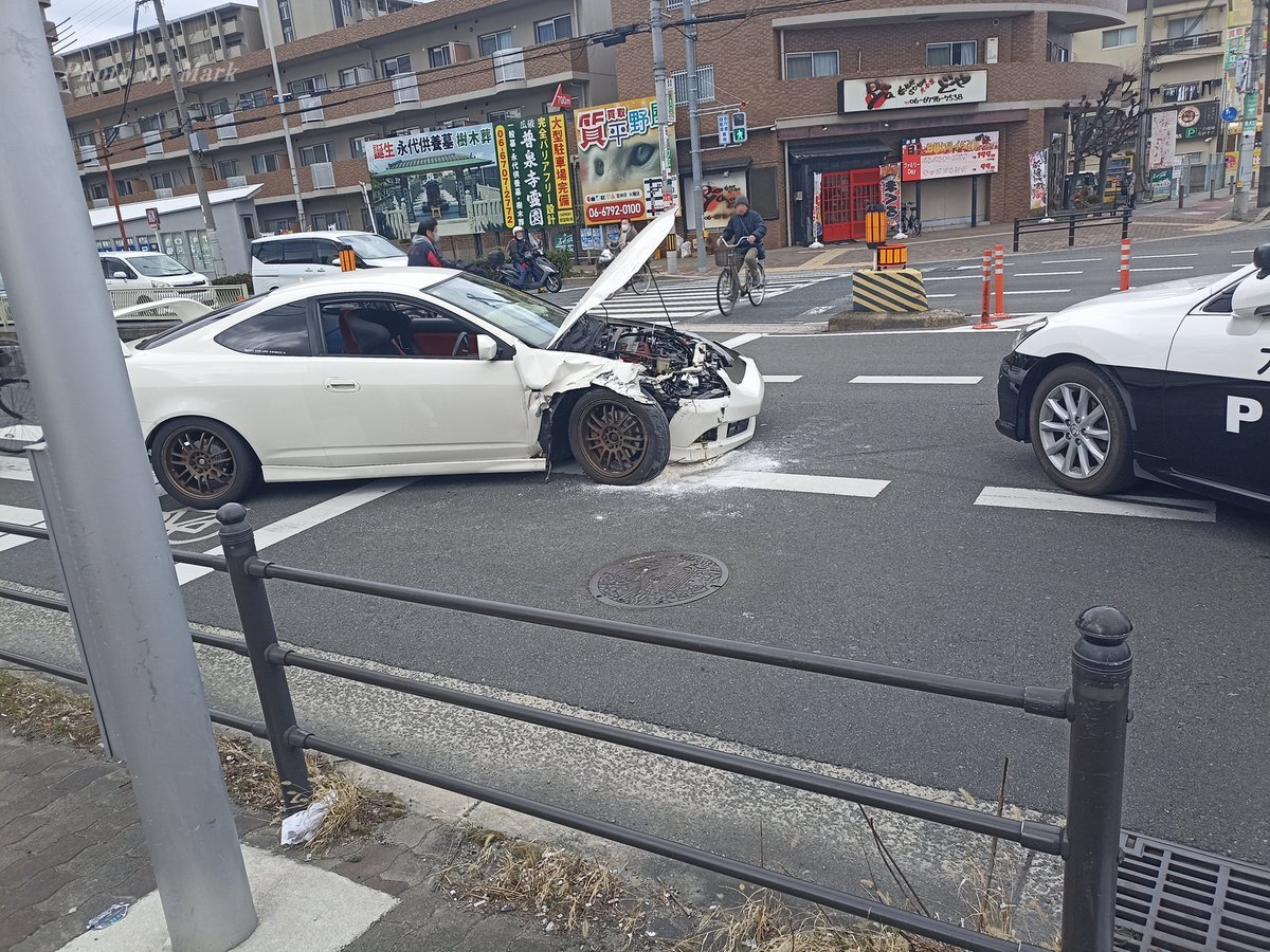 買い物で平野区の瓜破霊園近くを通ったら渋滞が出来ていて、一足早いお彼岸参りかな?と思ったら霊園前の交差点でDC5 ホンダインテグラとスズキソリオが衝突事故起こしていた。