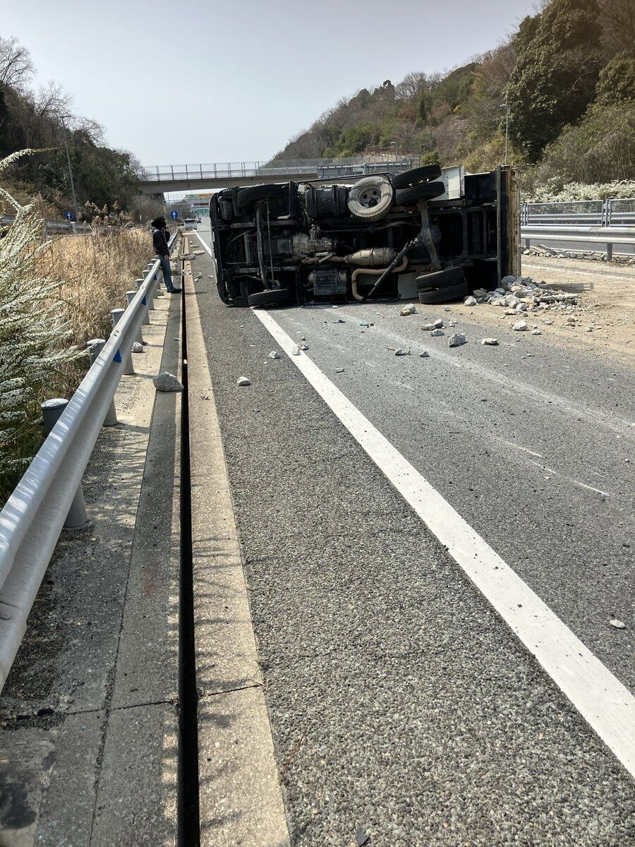 【現場の状況】#交通情報 阪神高速7号北神戸線 西行き 白川PA~しあわせの村付近 積荷砂利散乱するトラック横転事故で通行止め渋滞3月28日 #阪神高速 #兵庫県 #神戸