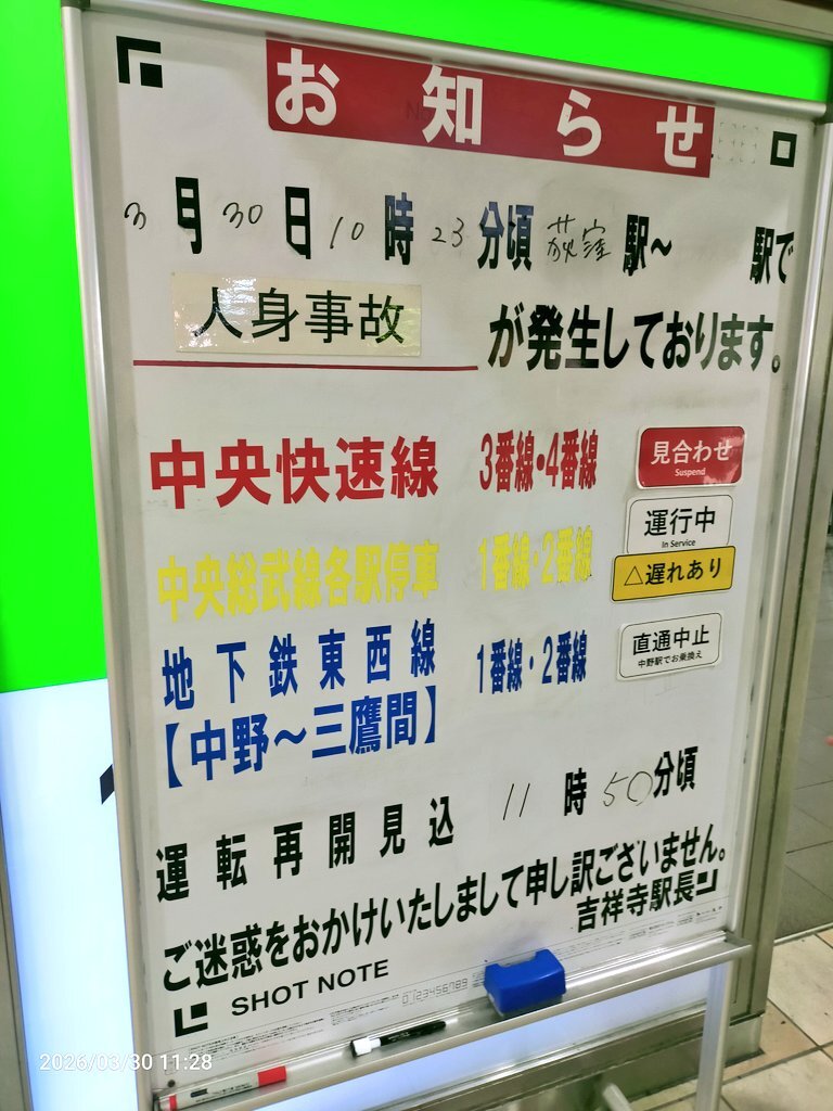 中央線快速電車は、荻窪駅での人身事故の影響で、東京〜三鷹駅間の上下線で運転を見合わせています。運転再開は11時50分頃を見込んでいます。三鷹〜高尾駅間は運転を再開しました。 #中央線快速電車 #Chuo_Line https://t.co/Bw82N3lIYZ— JR東日本【中央方面】運行情報 (公式) (@JRE_F_Chuo) March 30, 2026