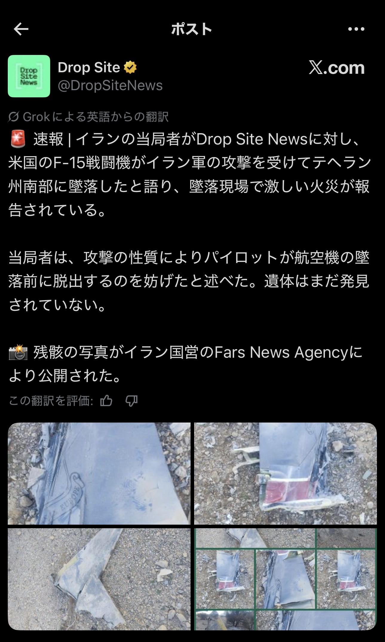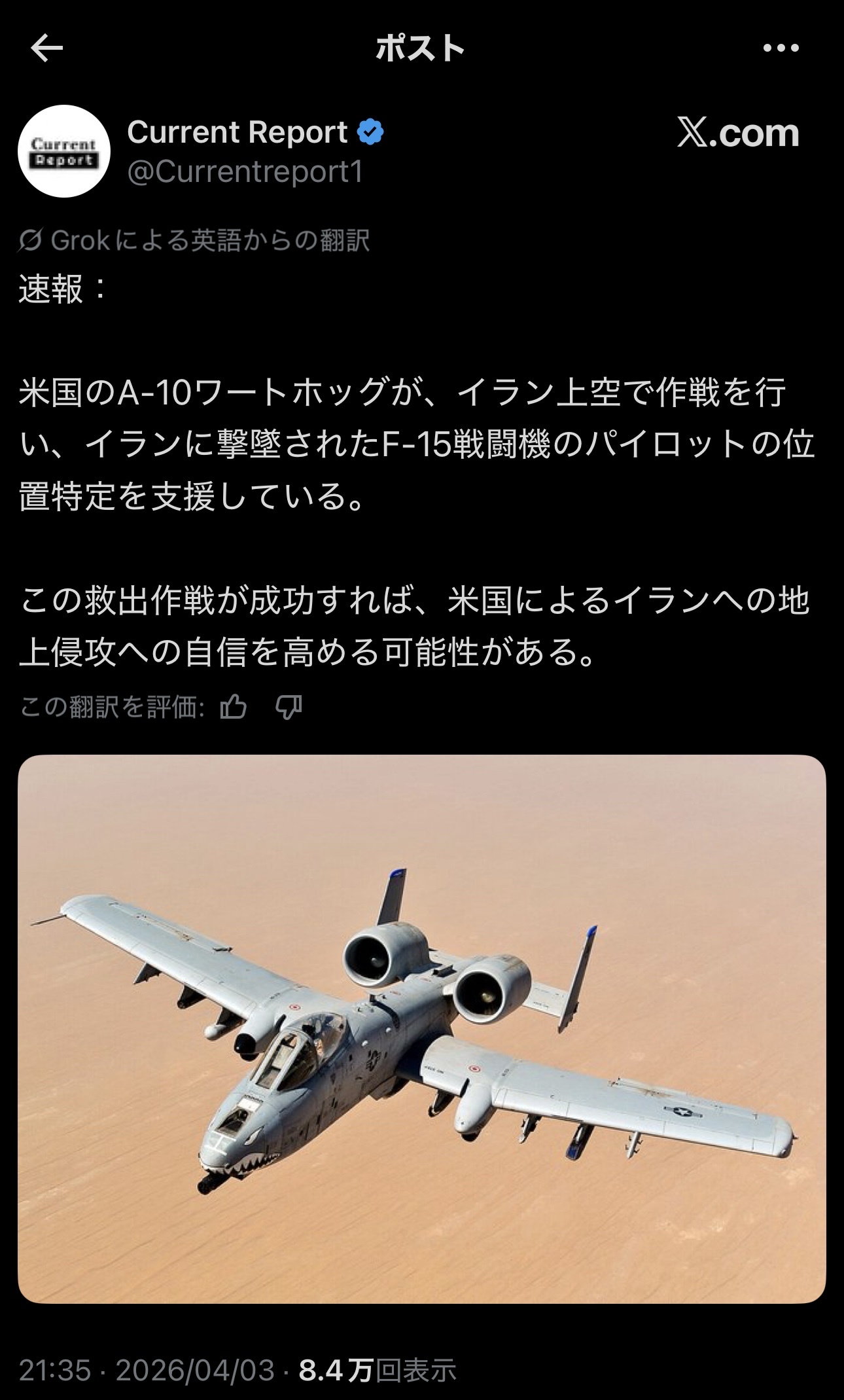 【速報】米軍F15戦闘機、イラン軍に撃墜される。パイロットは脱出できず米軍がイラン上空を捜索中 2026/4/4 トレンド 1: http://5ch.net document.write(” + ”); 関連記事 【悲報】投資家さん「日本政府はガソリン補助金に8,000億円超も支出できるなら、代わりにイランに通行料払って原油を確保した方が理に適っています。」 【悲報】日本さん「イランさあ、ホルムズ海峡封鎖やめないとEUと一緒に制裁するよ?」 【速報】米&イスラエル軍、イランの停戦協議責任者を爆撃!! 妻の殺害成功も本人は仕留め損なう 【悲報】トランプ大統領「強烈な打撃でイランを『石器時代』へと引き戻す」← 一体何が起こるんだ? 【朗報】トランプ「イランが停戦を求めてきた」ついに停戦か 【画像】秋葉原のバニーガール店にガチでとんでもないバニーがいると話題に document.write(” + ”); 続きを読む ——— Source: alfalfalfa.com 【速報】米軍F15戦闘機、イラン軍に撃墜される。パイロットは脱出できず米軍がイラン上空を捜索中