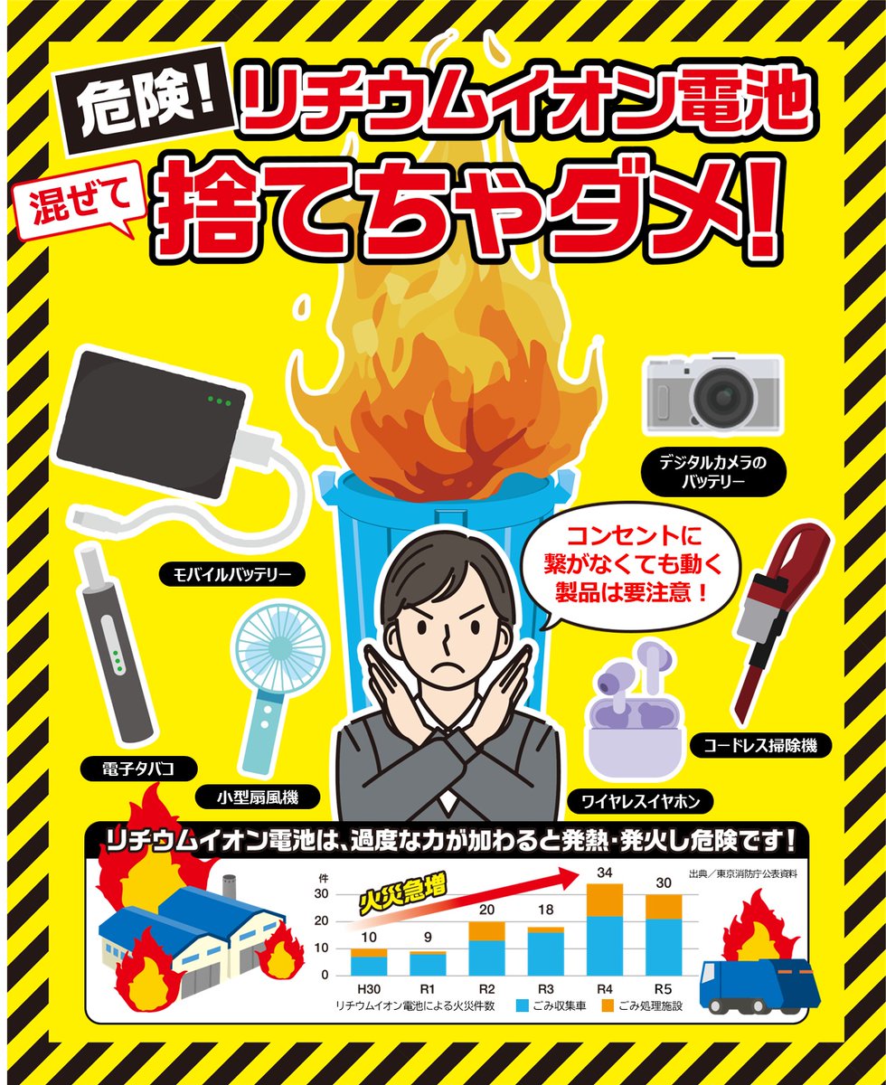 近年、リチウムイオン電池を使用した製品が増加しており、 廃棄物処理の過程における発熱・発火を原因とする、 収集運搬車両や廃棄物処理施設の火災事故が急増しています。