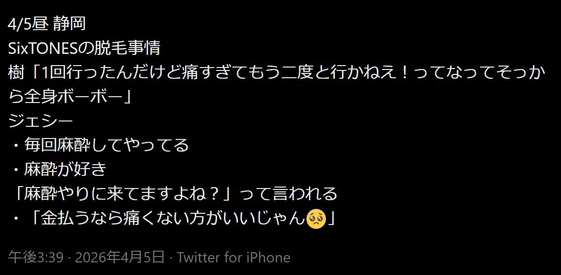 樹は脱毛に行かない分金が増えていく #SixTONES_MILESixTONES— ♡のあ♡ (@N0viluy33) April 5, 2026