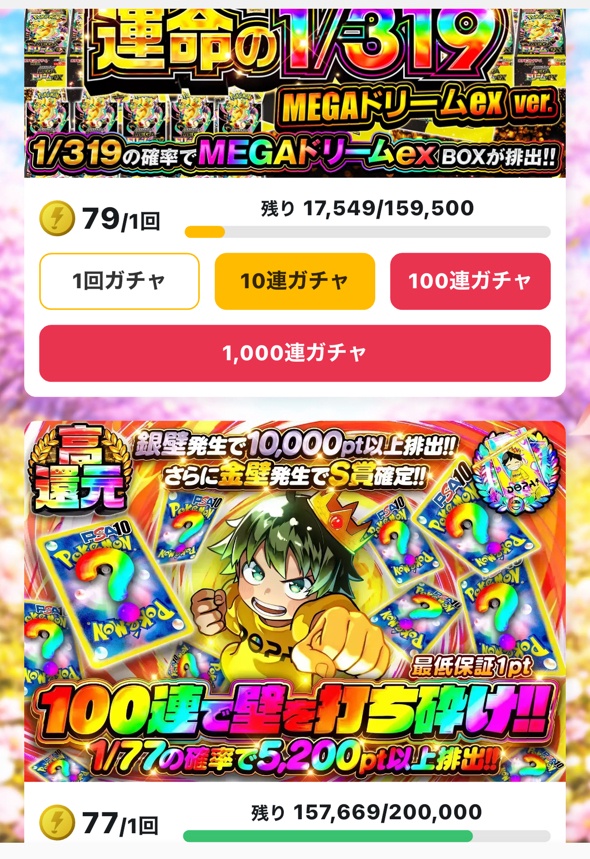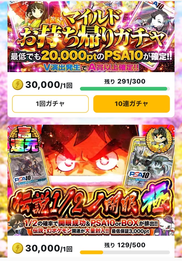 1回数十円から数万円とか様々なガチャがありいいものだと100万ぐらいのカードが当たる場合もある