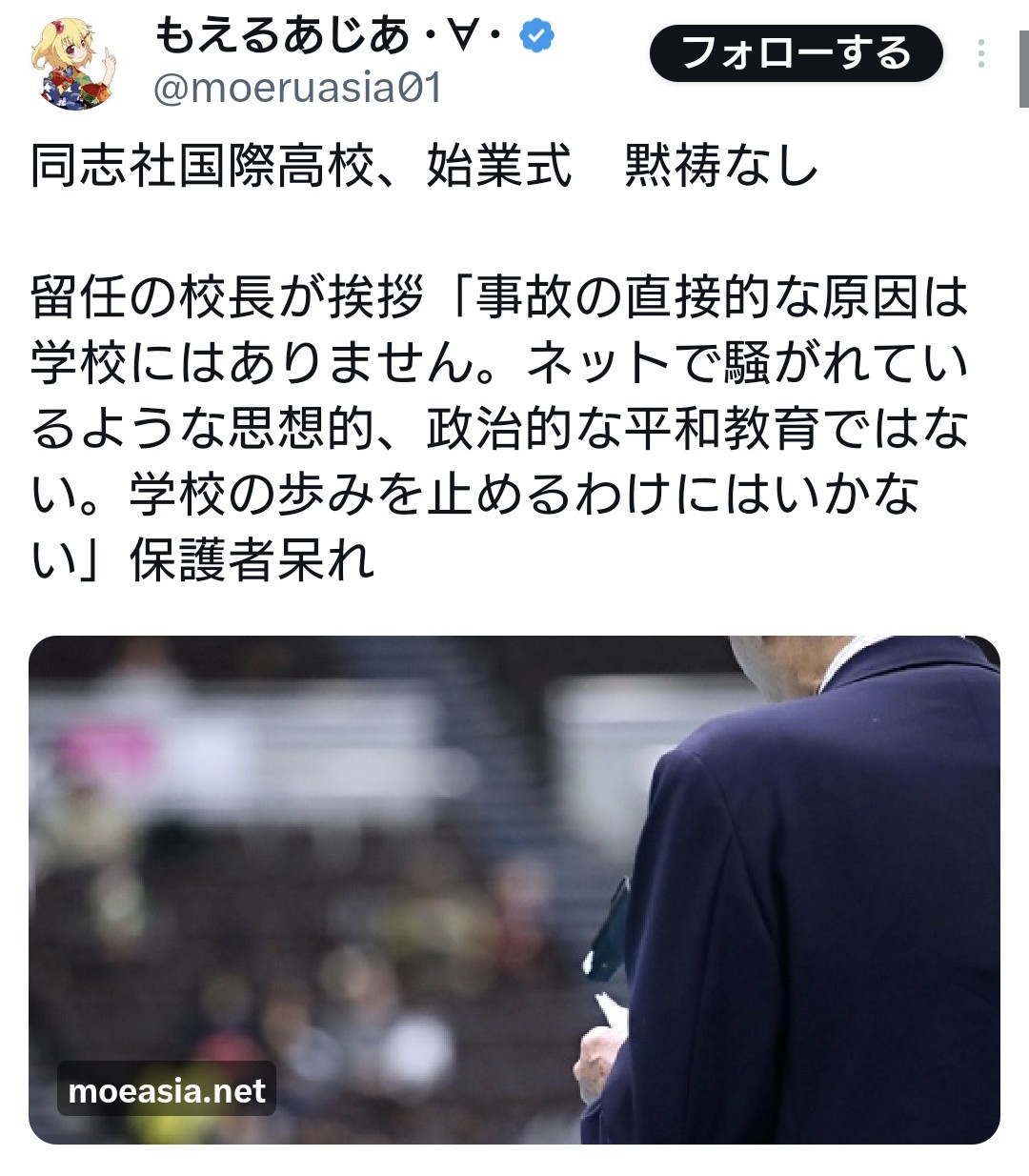 【悲報】同志社国際高校、始業式 黙祷なし 2026/4/12 トレンド 1: — (@moeruasia01) document.write(” + ”); 関連記事 【悲報】琉球新報「大浦湾の海難人身事故」 変な呼び方を始める…辺野古はNGワードか 【悲報】辺野古事故船長「亡くなった生徒はライフジャケットをちゃんと着てなかった」 【朗報】文科省、校外学習での「政治活動禁止」を通知 辺野古の事故を受け 【炎上】辺野古の遺族が公開した写真を活動家が煽る →垢消し逃亡した模様 【辺野古沖船転覆事故】TBS『ひるおび』、視聴者からの不興を買う 【画像】女さん「1時間目水泳だから水着着て登校しちゃった」→こうなるwww document.write(” + ”); 続きを読む ——— Source: alfalfalfa.com 【悲報】同志社国際高校、始業式 黙祷なし