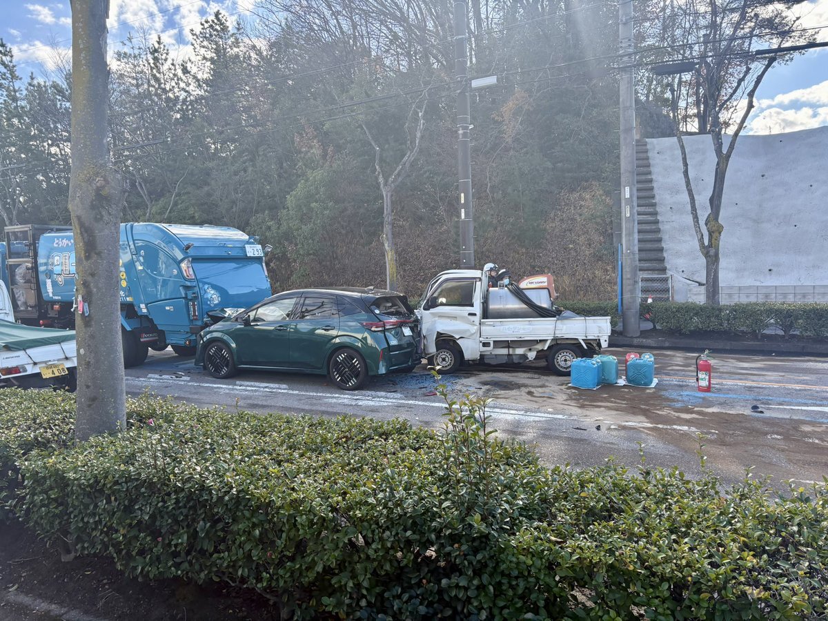 『岡崎市の光が丘交差点の近くで 玉突き事故燃料タンクを積んだ軽トラから 燃料が漏れてかなり臭いです。:( ;´꒳`;): 』